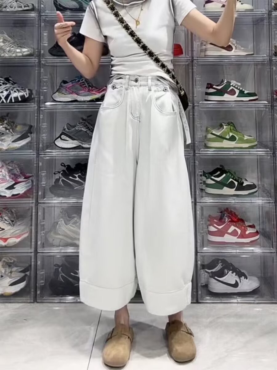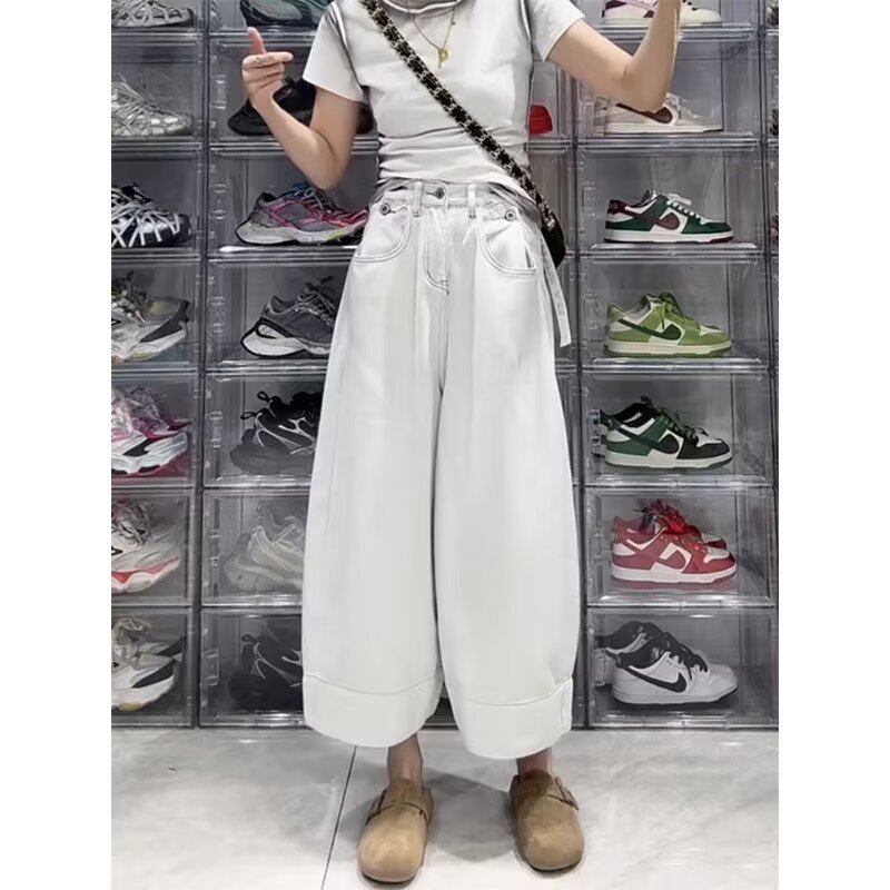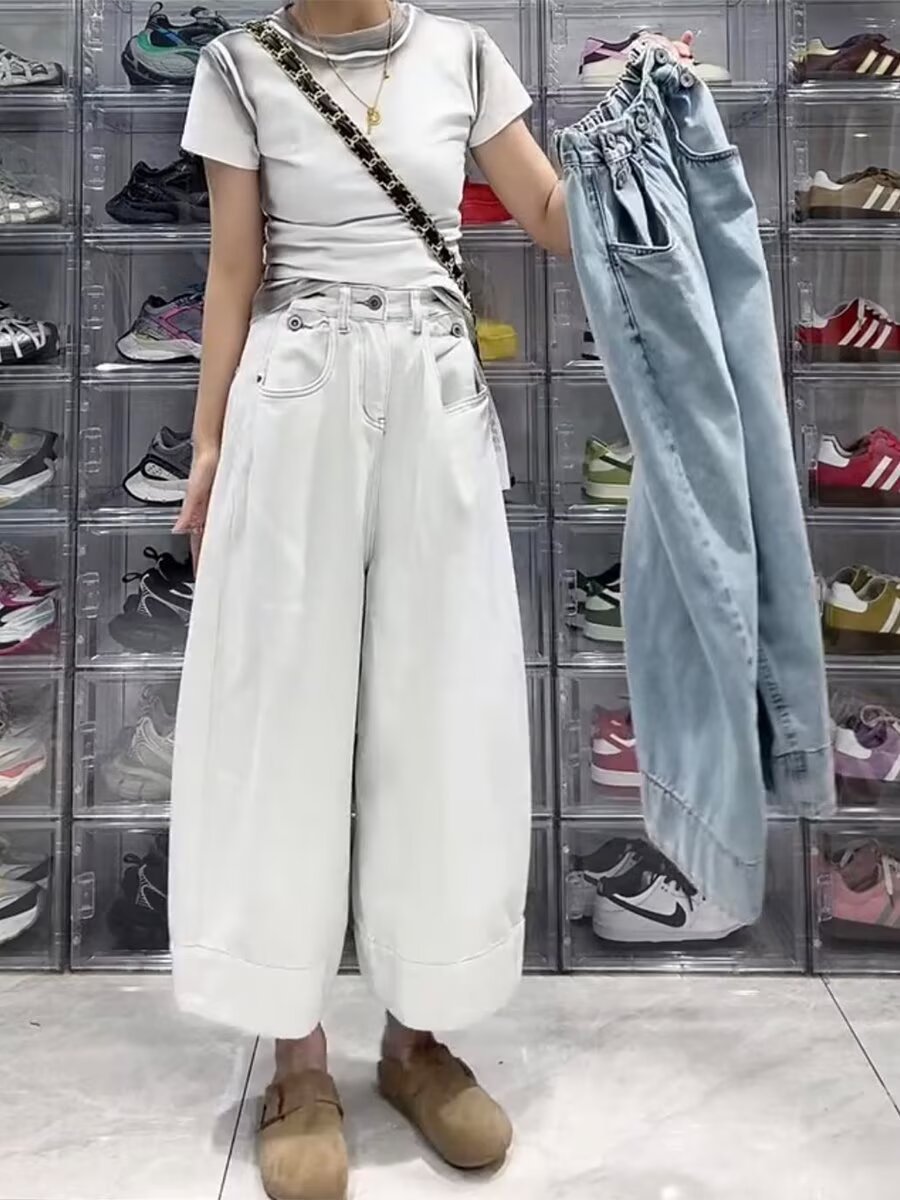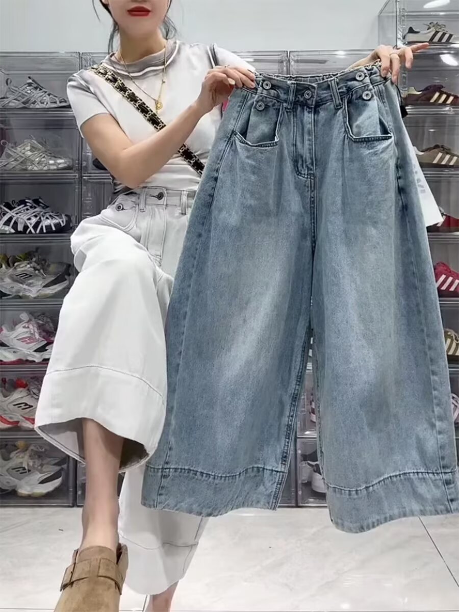 여성용 플러스 사이즈 레트로 9부 청바지 2025 봄 여름 뚱뚱한 mm 작은 헐렁한 하이 웨이스트 슬리밍 스트레이트 와이드 레그 팬츠스토어 가기