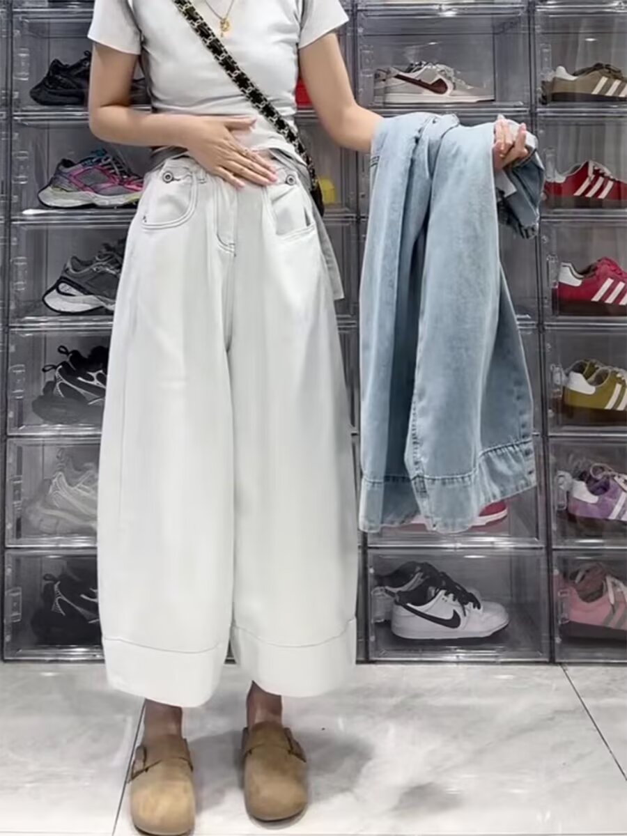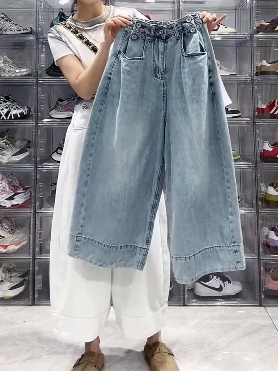 여성용 플러스 사이즈 레트로 9부 청바지 2025 봄 여름 뚱뚱한 mm 작은 헐렁한 하이 웨이스트 슬리밍 스트레이트 와이드 레그 팬츠