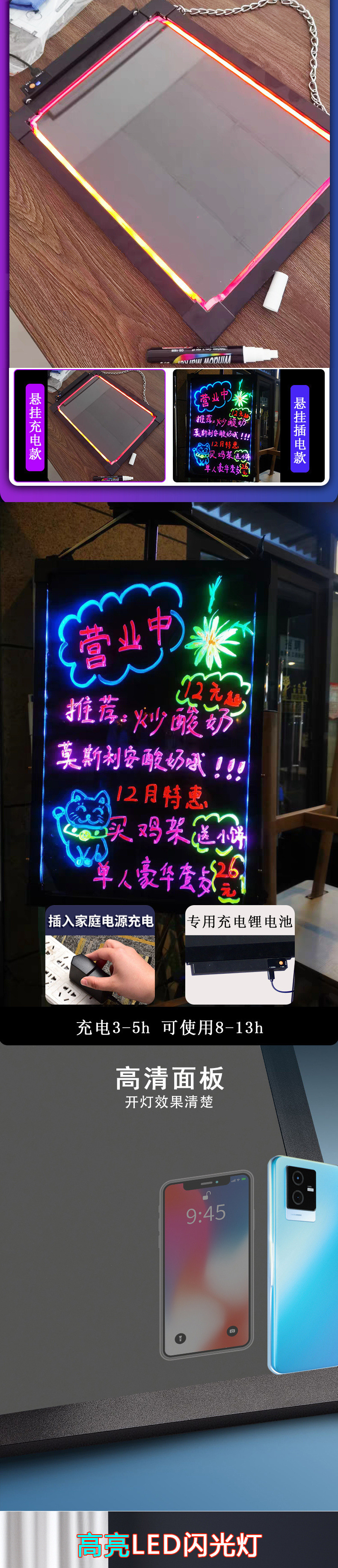 빛나는 작은 칠판 광고판 LED 형광 광고판 손으로 쓴 플래시 단어 조명 충전 야시장 긴 배터리 수명