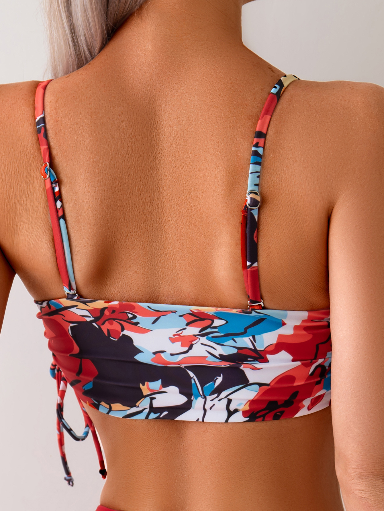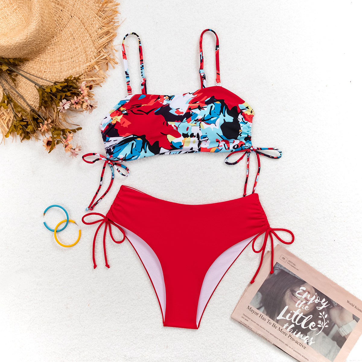 해외 창고 직송 프린트 슬링 드로스트링 튜브탑 솔리드 컬러 하이웨이스트 브리프 비키니 세트