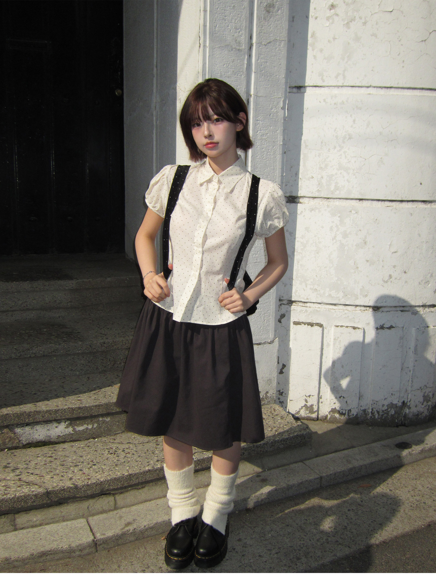 재고 2025 년 여름 새 한국 동대문 순면 타이트 허리 폴크포인트 짧은 소매 셔츠 여성용 높은 허리 스커트