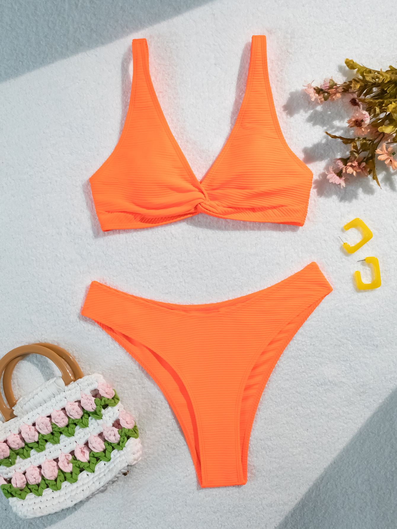 해외 창고에서 직배송되는 신상 여성용 단색 이쑤시개 무늬 트위스트 컵 탱크탑 삼각팬티 비키니 투피스 세트