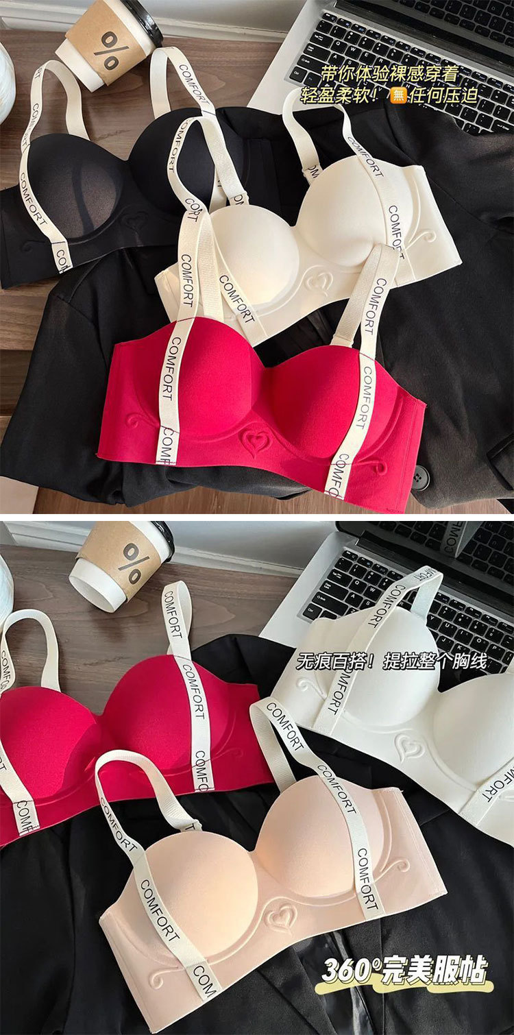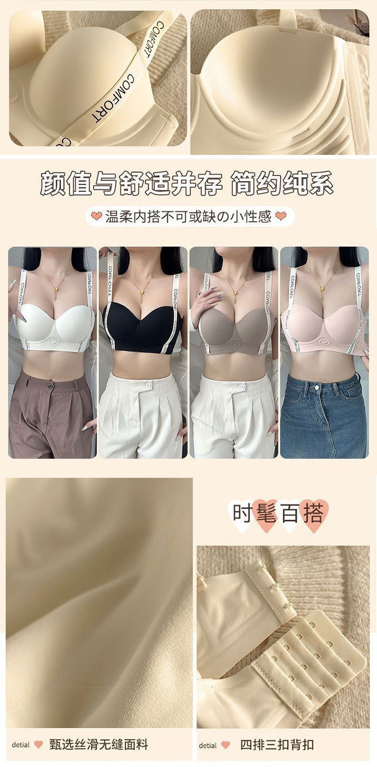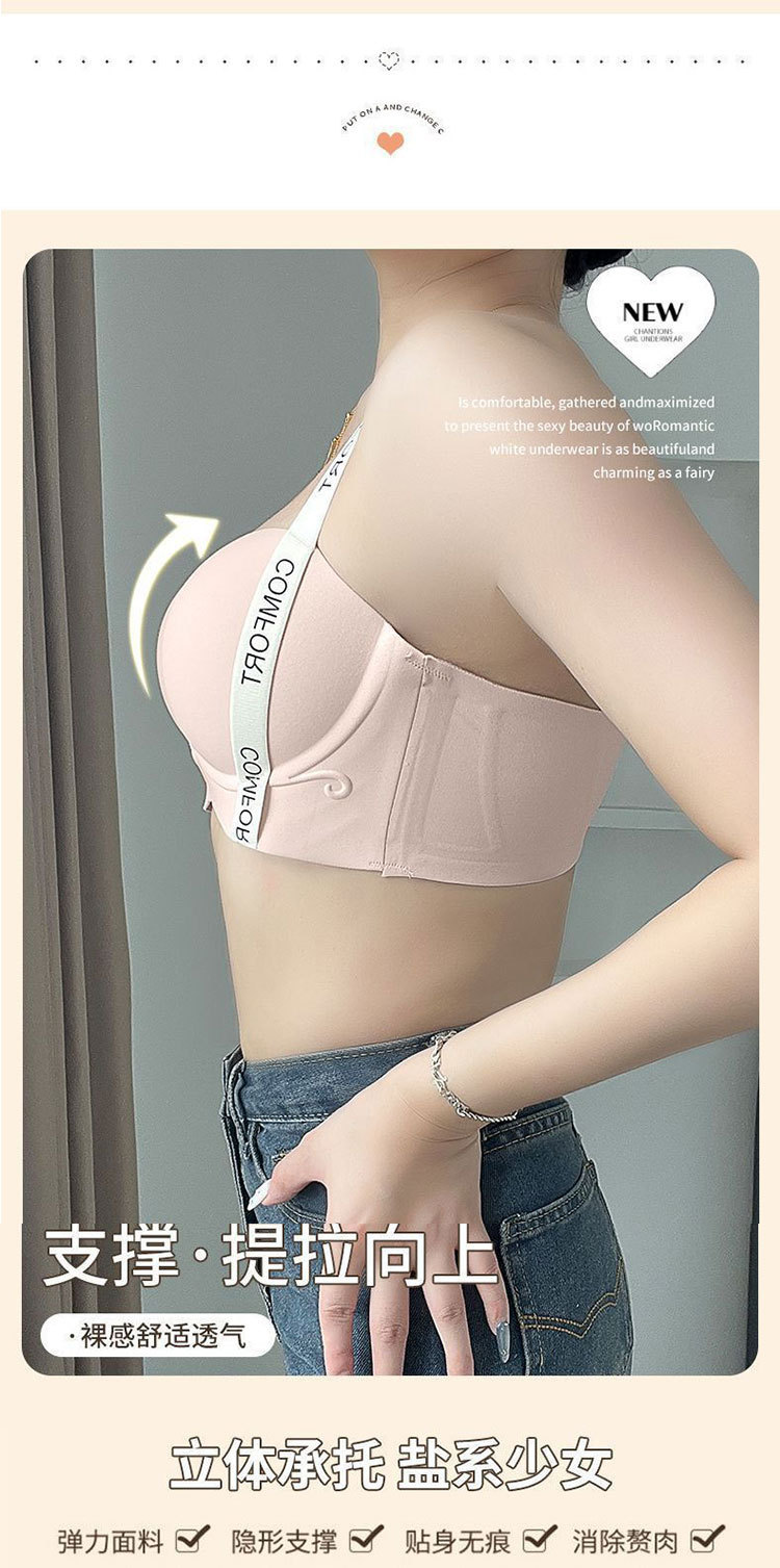 작은 가슴을 가진 여성을 위한 Douyin의 인기 있는 심리스 하프 컵 브라, 푸쉬업, 큰 레터링 숄더 스트랩, 소프트 서포트 브라