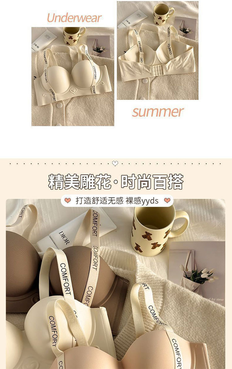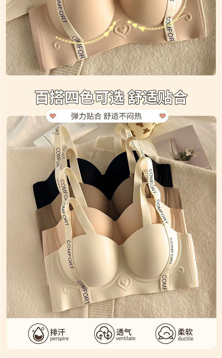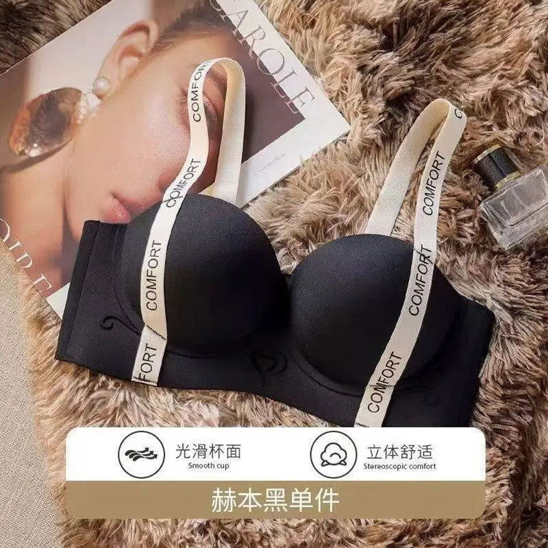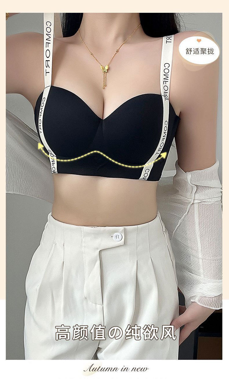 작은 가슴을 가진 여성을 위한 Douyin의 인기 있는 심리스 하프 컵 브라, 푸쉬업, 큰 레터링 숄더 스트랩, 소프트 서포트 브라