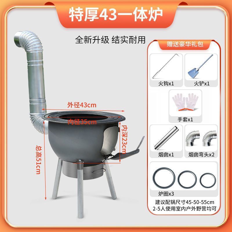 • 점주 슈 [특대 두꺼운 일체형 스탬프 장작 난로] - 43cm 특대형 모델 + 난로 링 3개 + 냄비 + 뚜껑 + 스푼