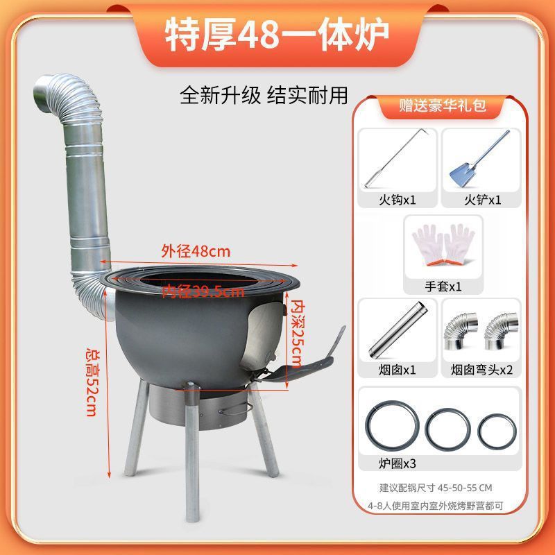 • 점주 슈 [특대 두꺼운 일체형 스탬프 장작 난로] - 48cm 특대형 모델 + 난로 링 3개 + 냄비 + 뚜껑 + 스푼