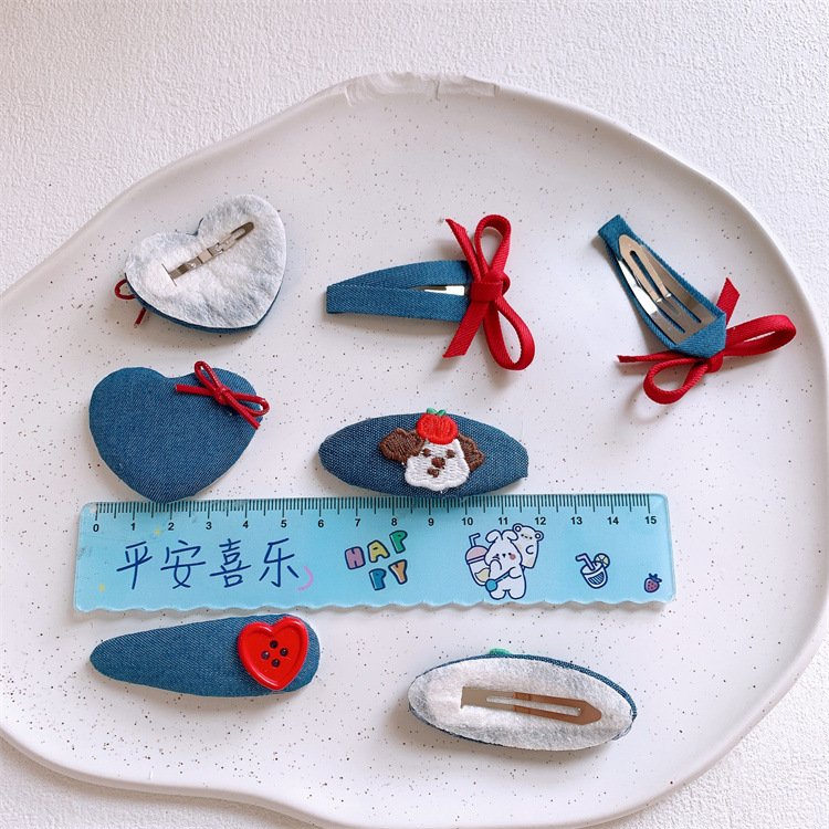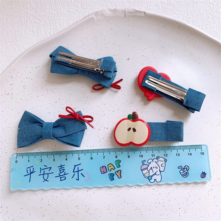 새로운 어린이 빨간 활 헤어핀 소녀의 사랑 과일 원단 데님 깨진 머리 BB 클립 측면 클립 클립