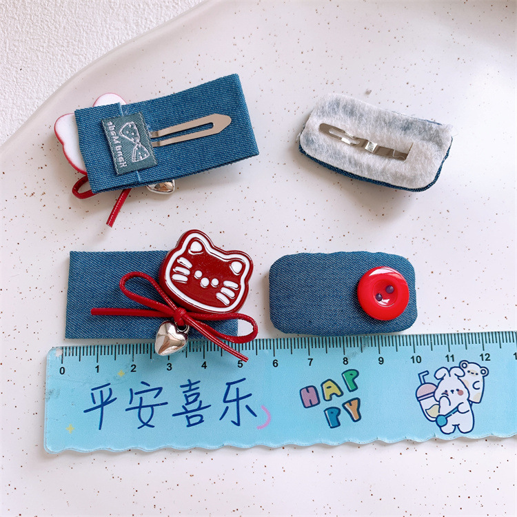 새로운 어린이 빨간 활 헤어핀 소녀의 사랑 과일 원단 데님 깨진 머리 BB 클립 측면 클립 클립스토어 가기