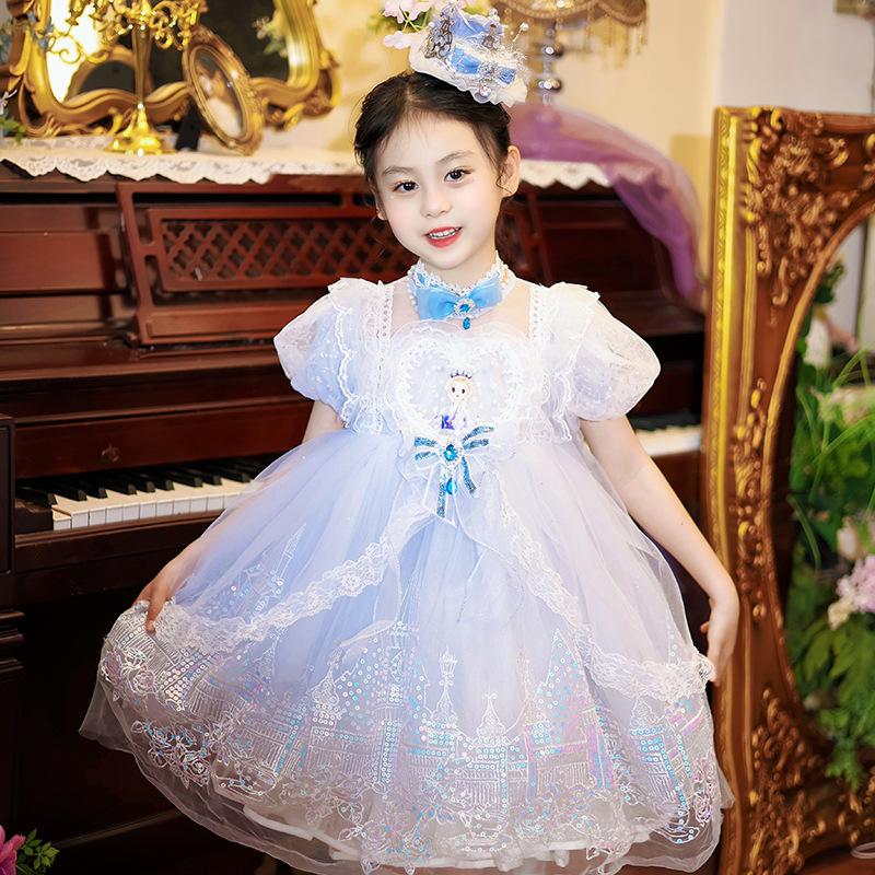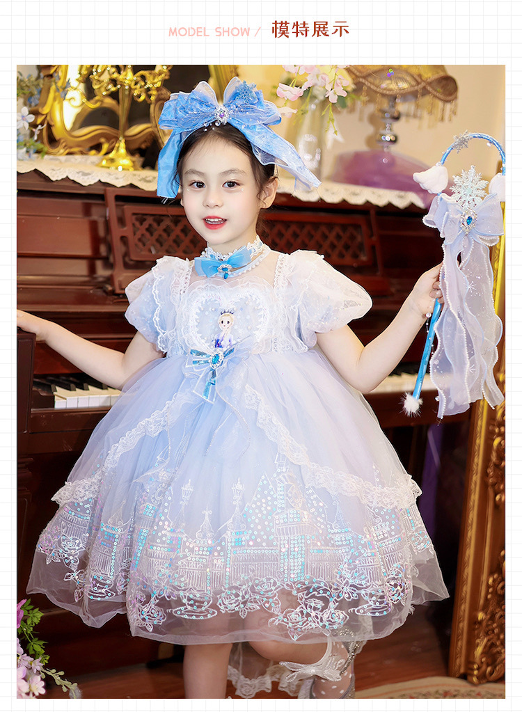 겨울왕국 공주 드레스 여름 드레스 소녀의 세련된 반팔 엘사 퍼프 스커트 아기 생일 레이스 드레스