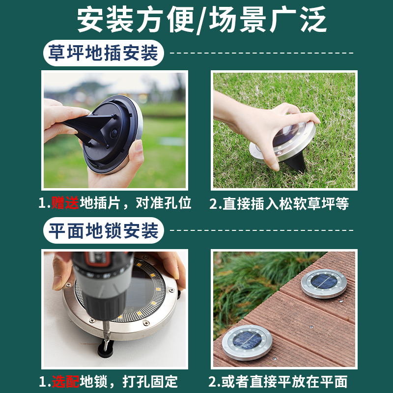 • 설치 다이어그램: 잔디에 삽입, 바닥에 평평하게 놓기, 접지 잠금 장치 잠금