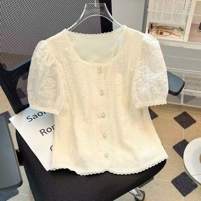여성을위한 프렌치 퍼프 슬리브 레이스 탑 여름 새로운 기질 쉬폰 셔츠 반팔 플러스 사이즈 여성 셔츠