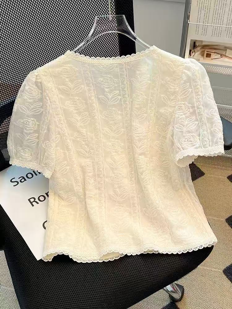 여성을위한 프렌치 퍼프 슬리브 레이스 탑 여름 새로운 기질 쉬폰 셔츠 반팔 플러스 사이즈 여성 셔츠스토어 가기