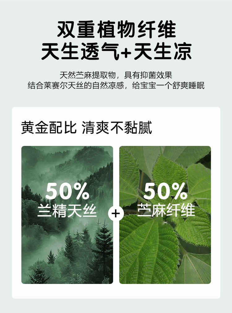 在保持苎麻透气性好的前提下,添加天丝后中和了苎麻的粗糙手感使其能够既透气又柔软,更适合宝宝去使用