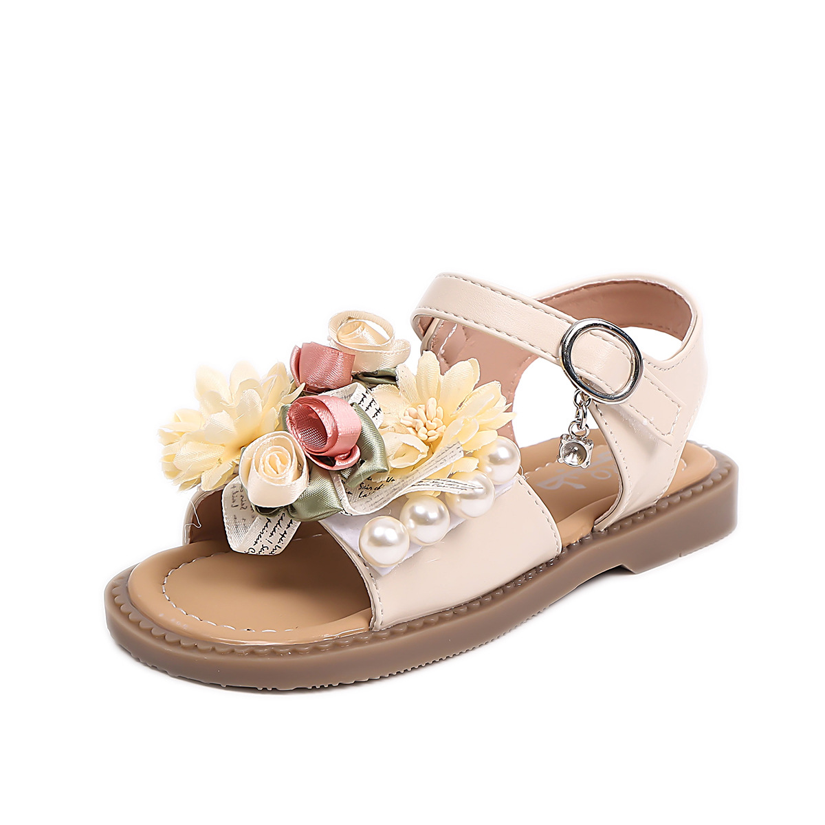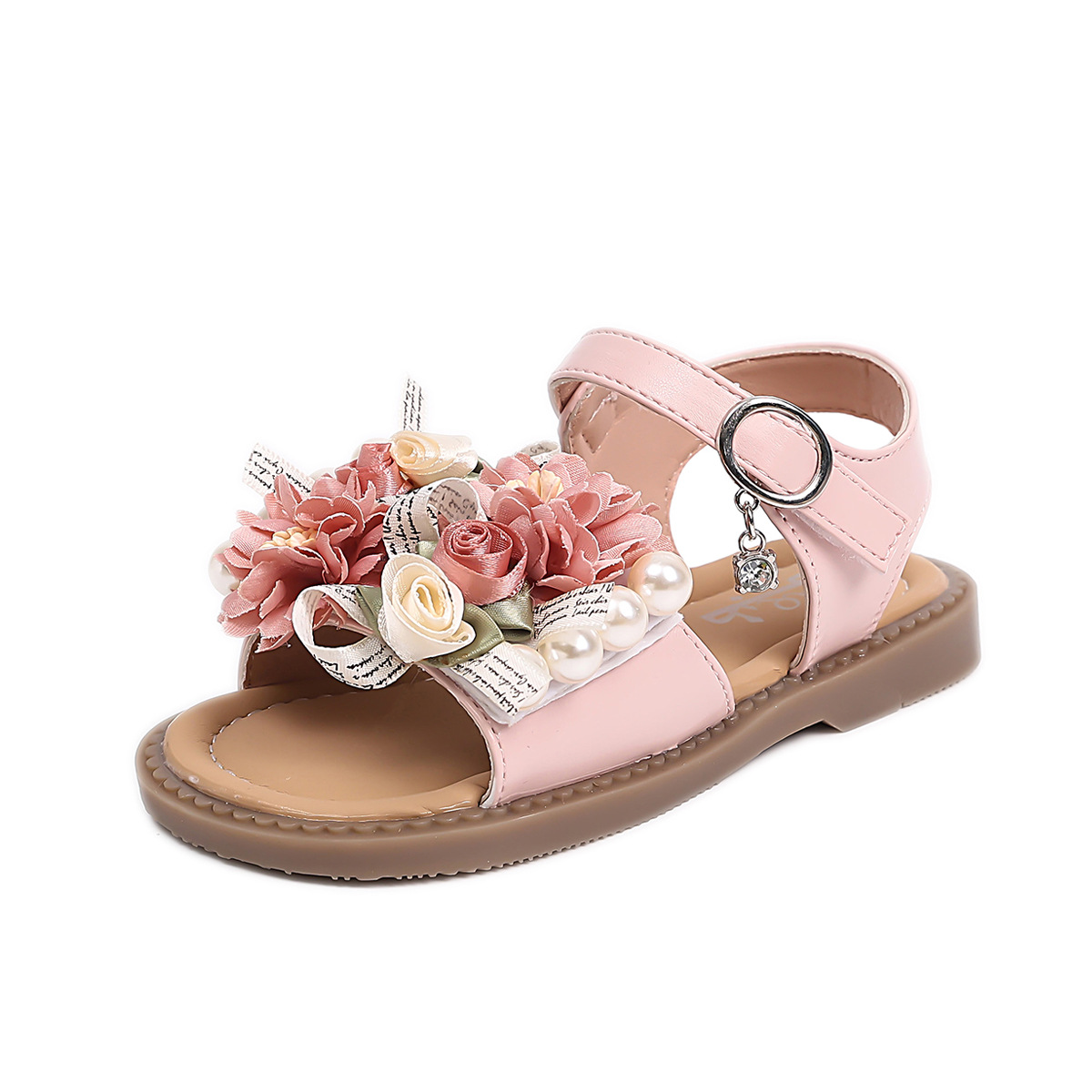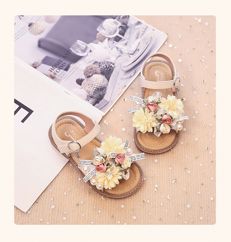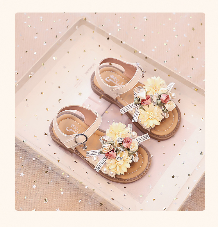2025 새로운 여름 소녀 진주 꽃 오픈 발가락 샌들 달콤한 소녀 캐주얼 스포츠 비치 신발