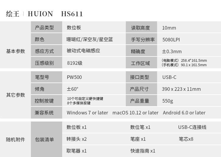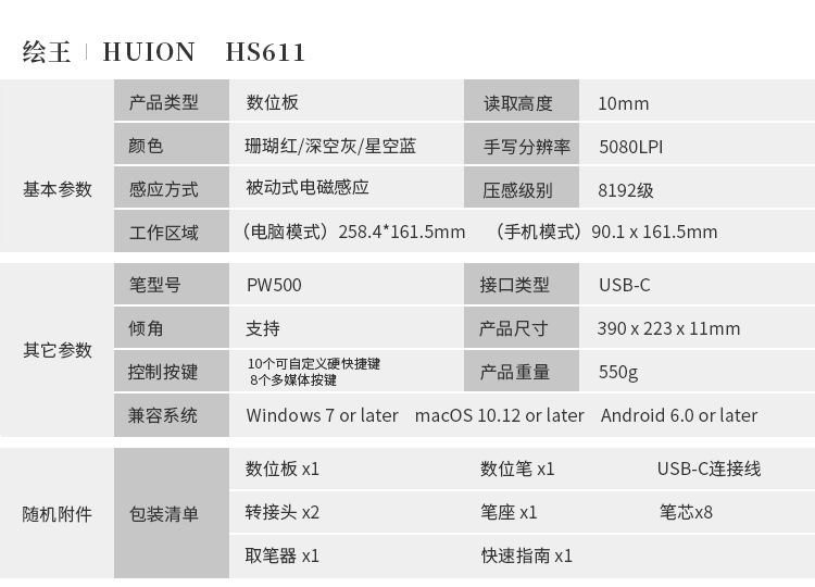 HUION 필기 태블릿 HS611 디지털 태블릿 드로잉 태블릿 그리기 태블릿 온라인 수업 교육 도구