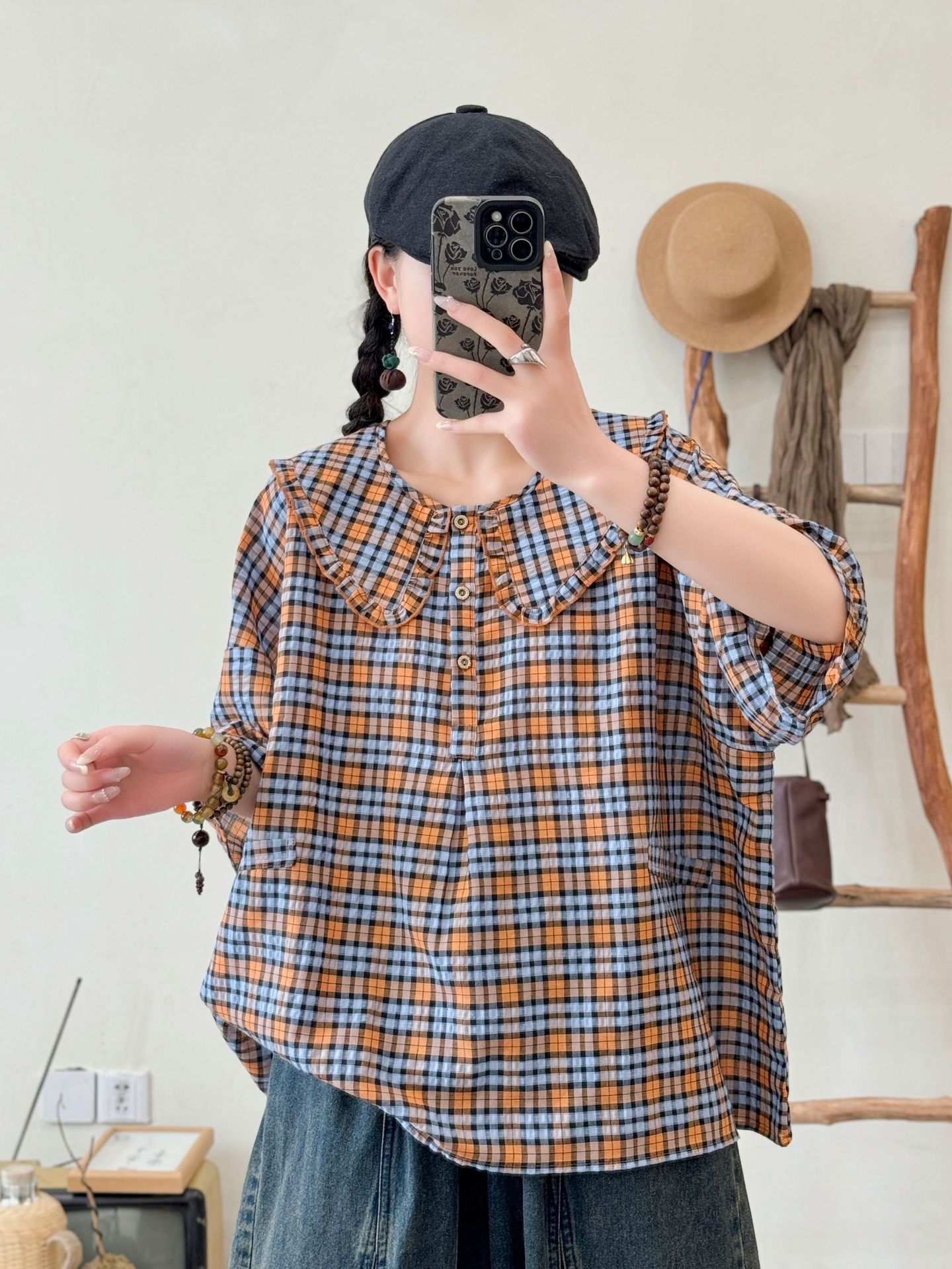 일본식 신형 인형 칼라 셔츠 여성 한국 스타일 스위트 레이스 플레이드 느슨한 크고 중간 크기의 소매 면 인형 셔츠