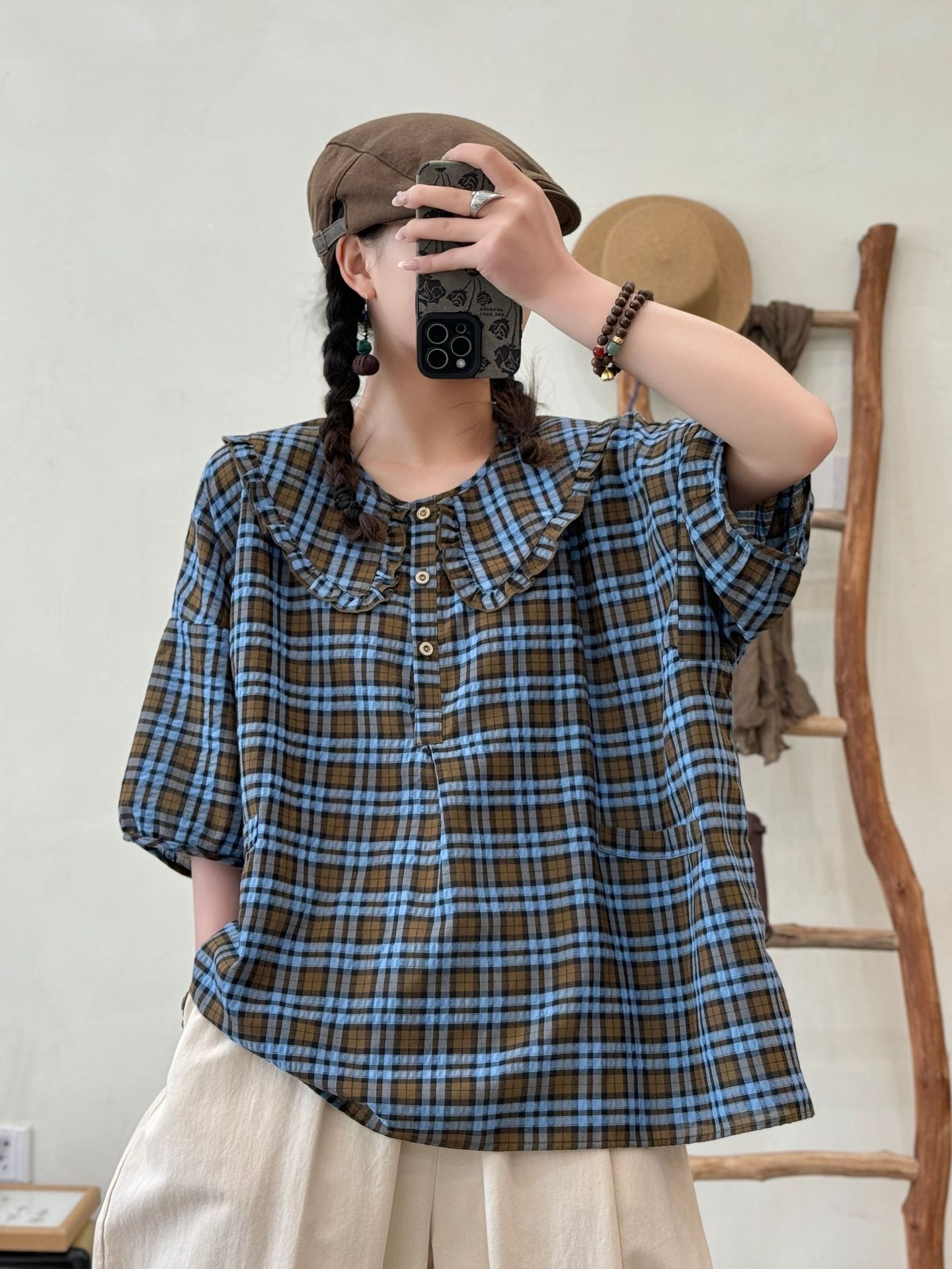 일본식 신형 인형 칼라 셔츠 여성 한국 스타일 스위트 레이스 플레이드 느슨한 크고 중간 크기의 소매 면 인형 셔츠스토어 가기