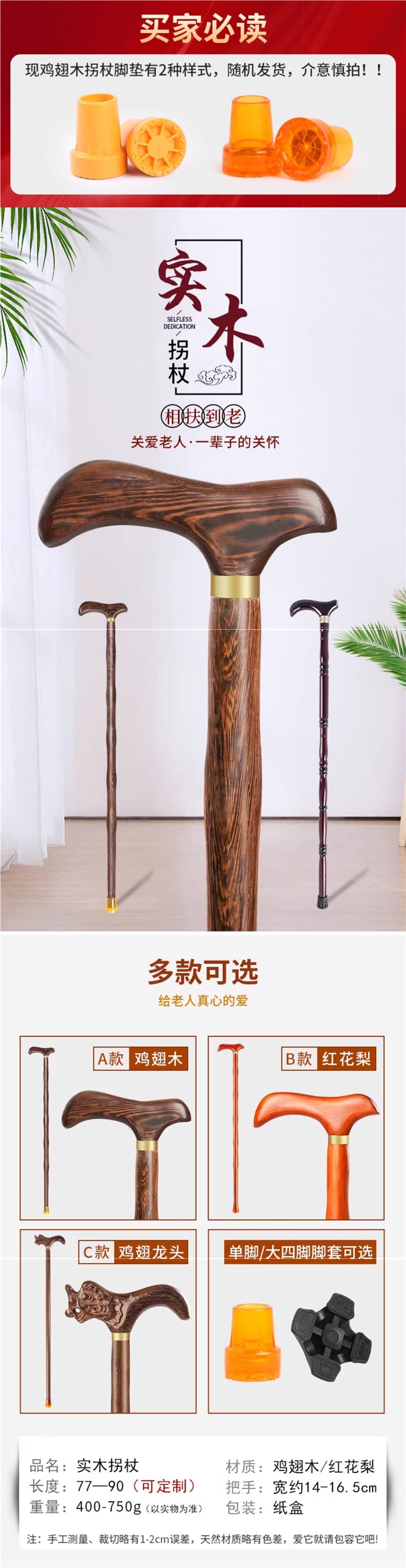 • 닭 날개 나무 목발 90cm(두꺼운 미끄럼 방지 고무 커버 포함) 165-175cm