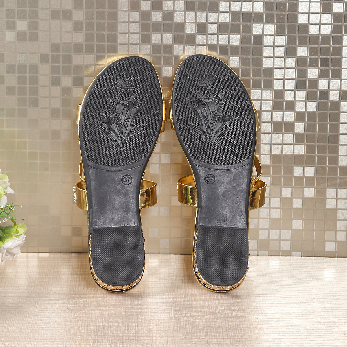 35-43 대형 크로스보더 여성용 하이힐 샌들, 라인스톤 오픈토 로우힐 골드 엄마 슬리퍼 Xia Xin