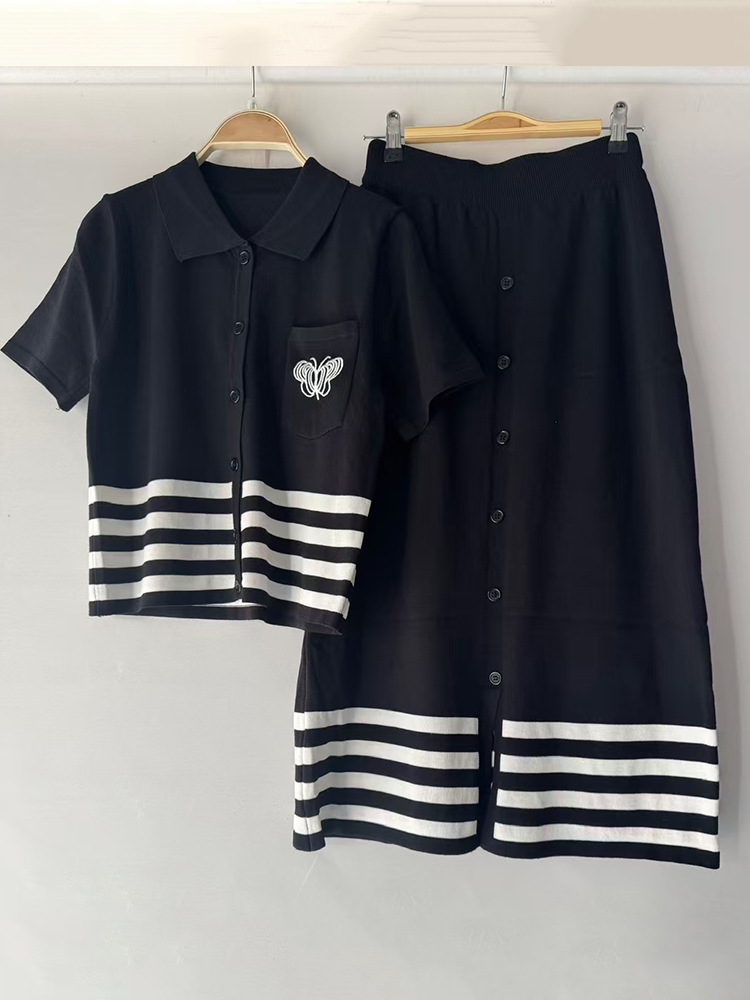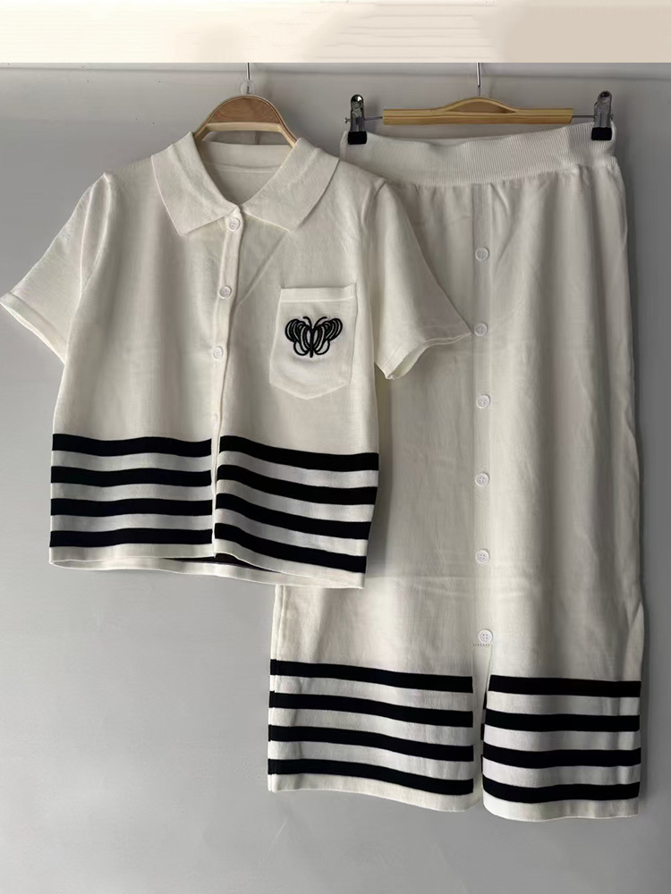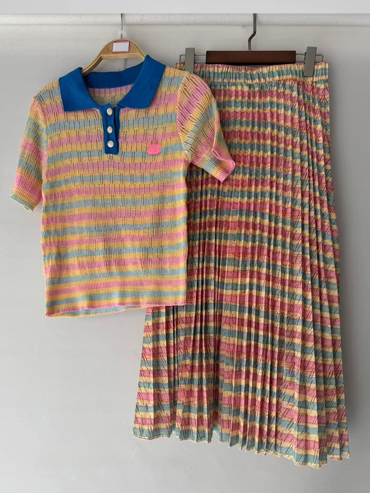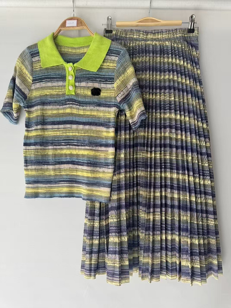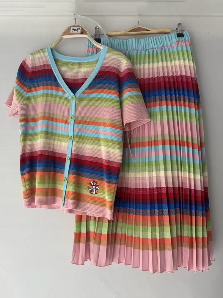 2025 대외 무역 여성 복고풍 줄무늬 니트 카디건 풀오버 2 피스 느슨한 주름 치마 세트스토어 가기