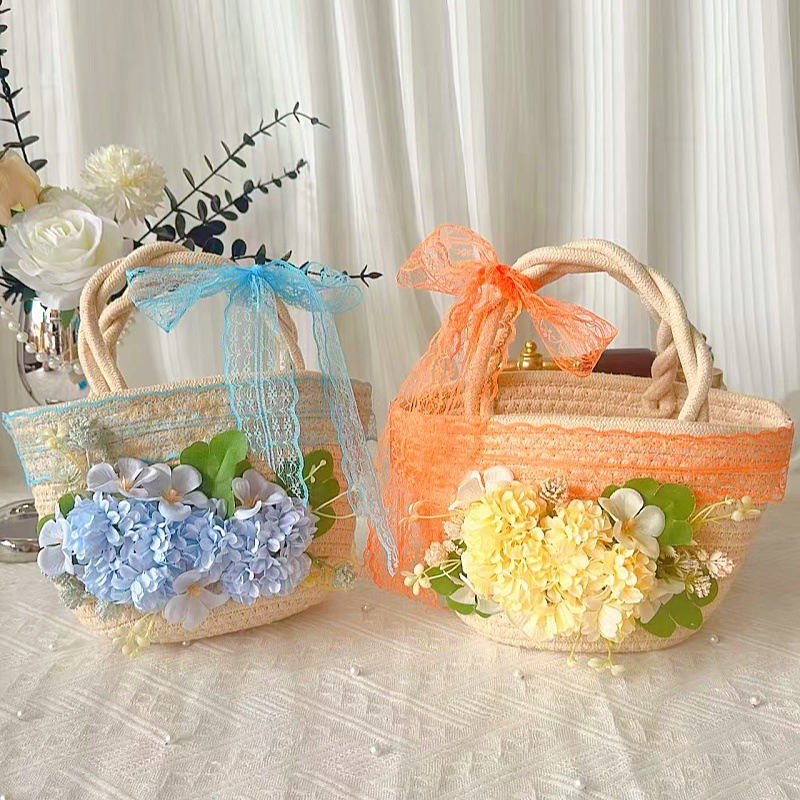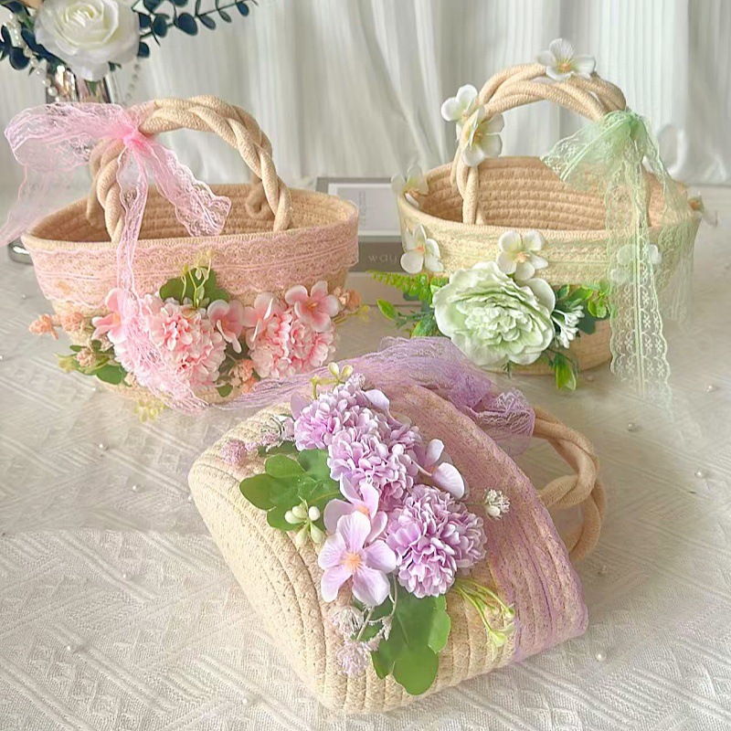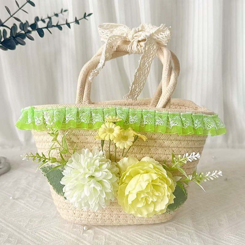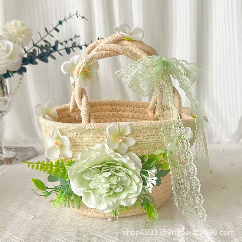 • 천연 코튼 로프 우븐 백 + E 스타일 그린 실크 부케