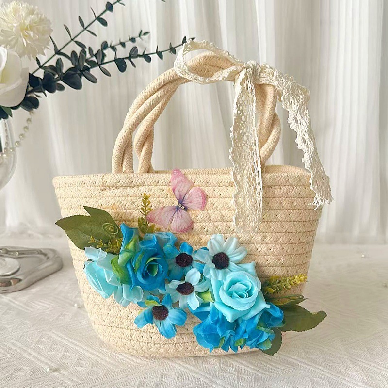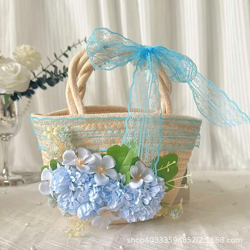 • 내추럴 컬러의 코튼 로프 우븐 백 + 13호 봉지 실크 플라워 + 블루 플리츠 레이스