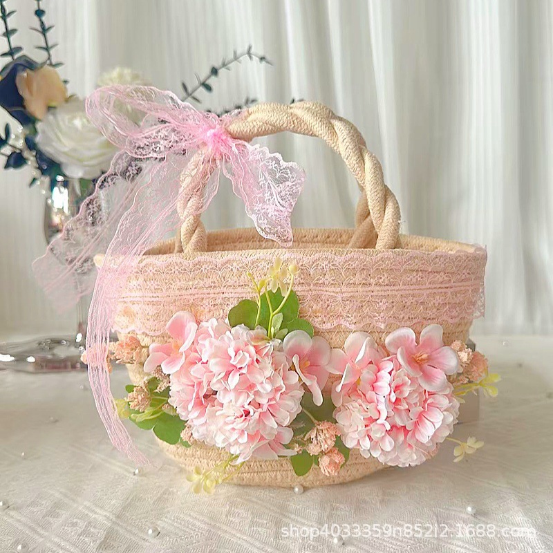 • 내추럴 코튼 로프 우븐 백 + C 스타일 다크 핑크 실크 부케