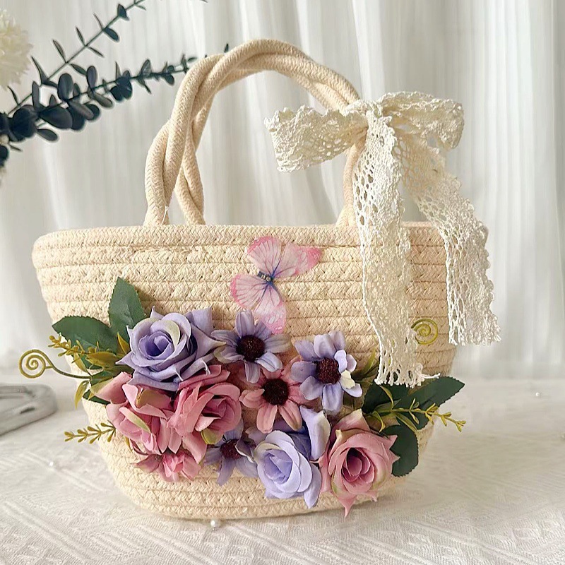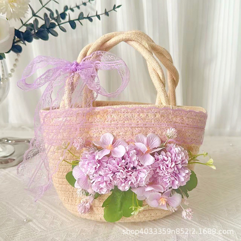 • 천연 면 로프 직조 가방 + C 스타일 보라색 실크 부케