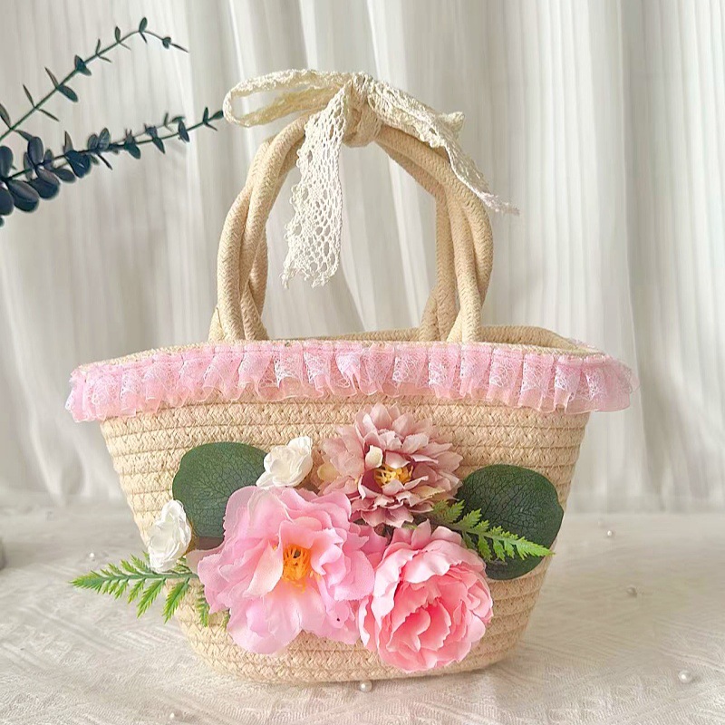 • 내츄럴 코튼 로프 우븐백 + 11호 봉지 실크 플라워 + 핑크 플리츠 레이스