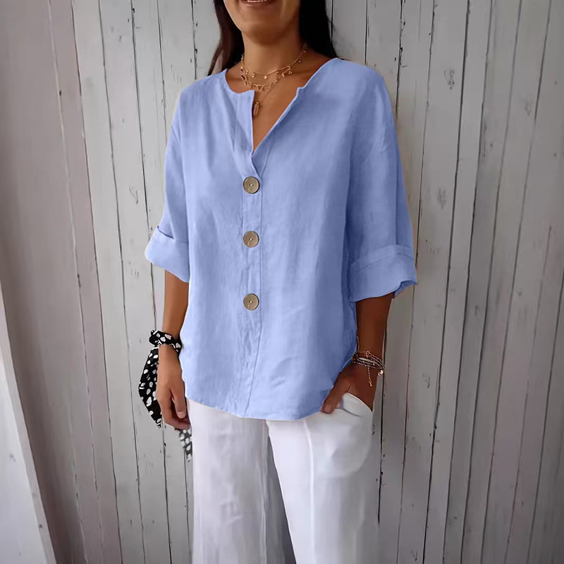 아마존 2025 국경 유럽 및 미국 여름 새로운 느슨한 티셔츠 여성을위한 편안한 캐주얼 V 넥 코튼 리넨 버튼 탑