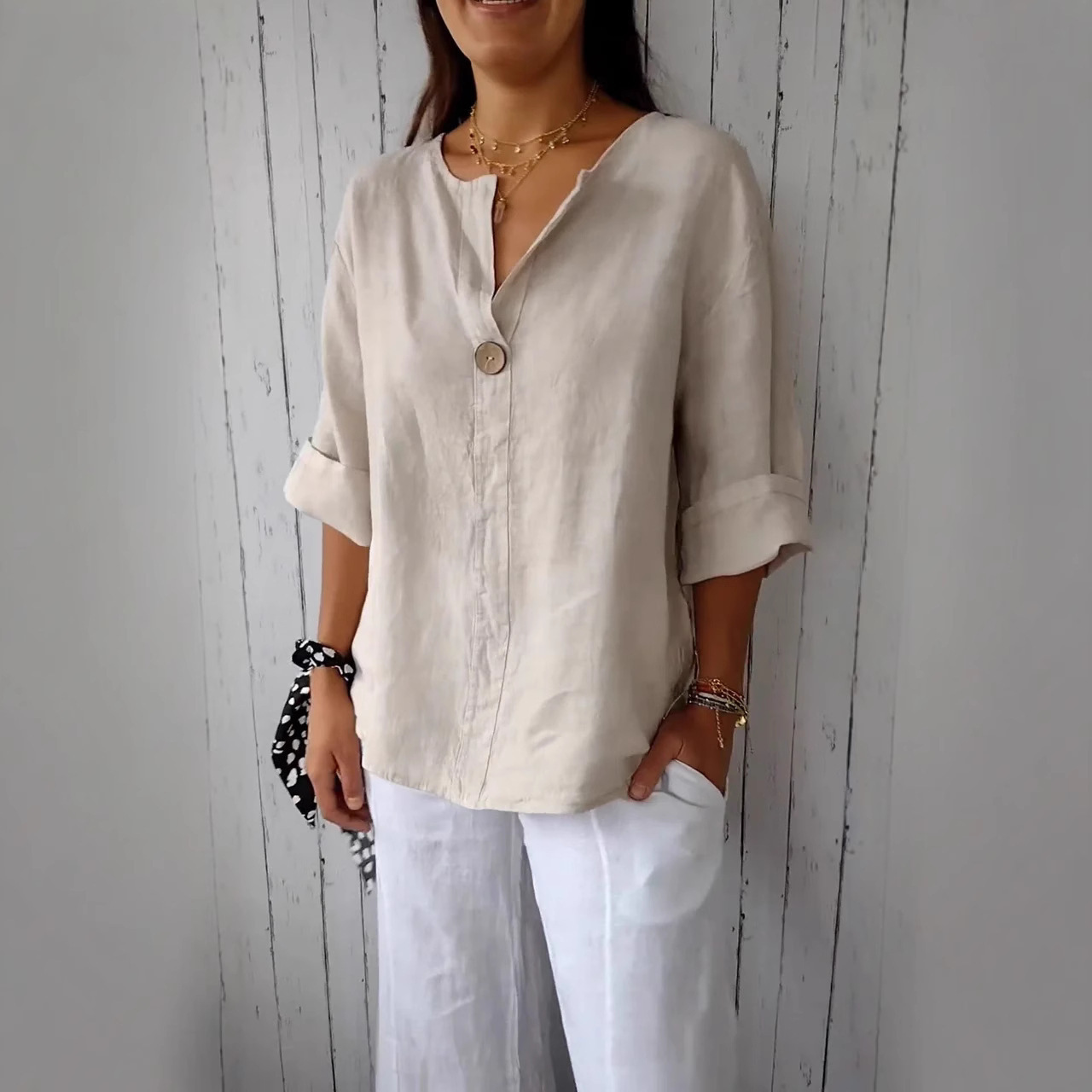 亚马逊2025跨境欧美夏季新款宽松T恤衫舒适休闲V领棉麻纽扣上衣女