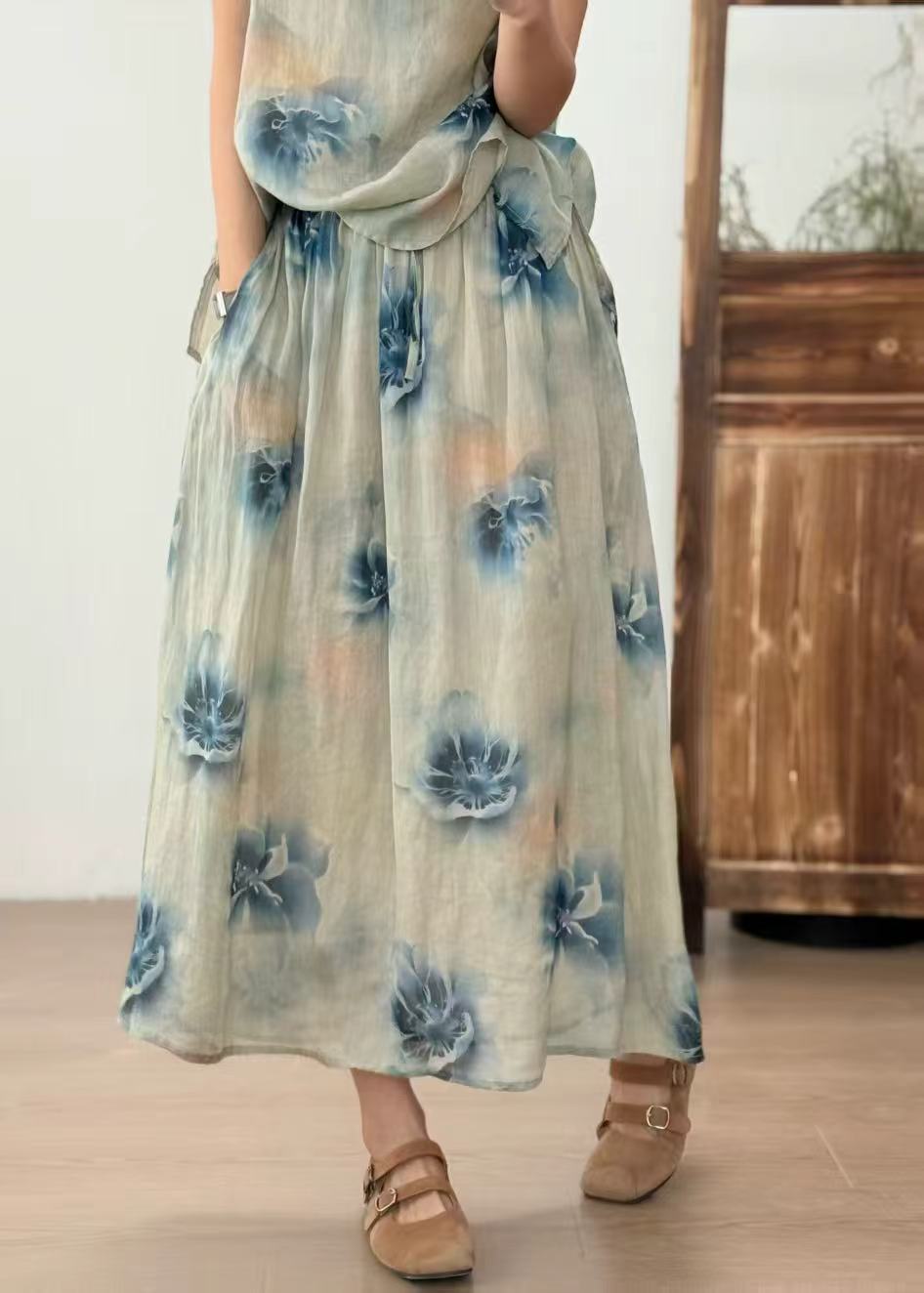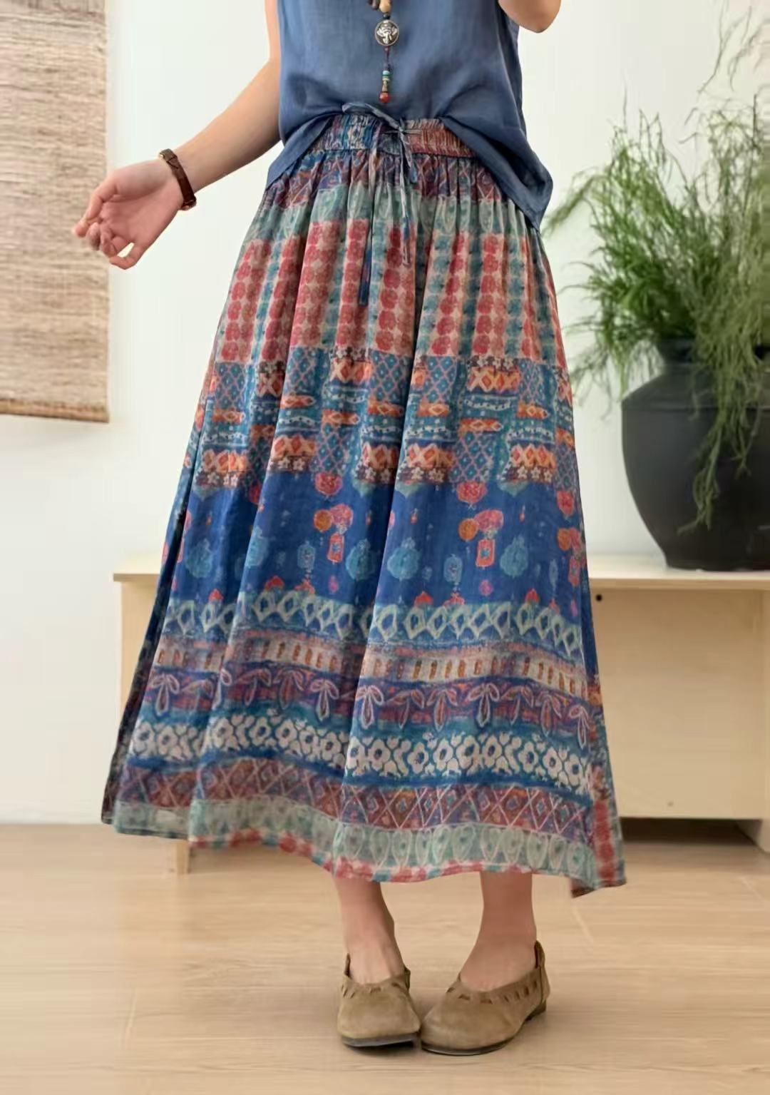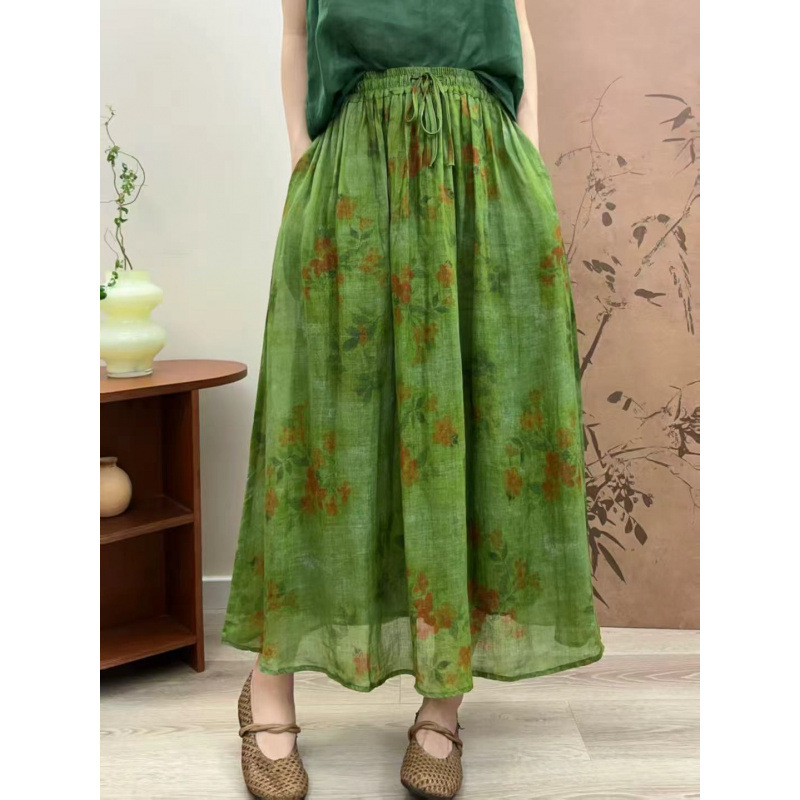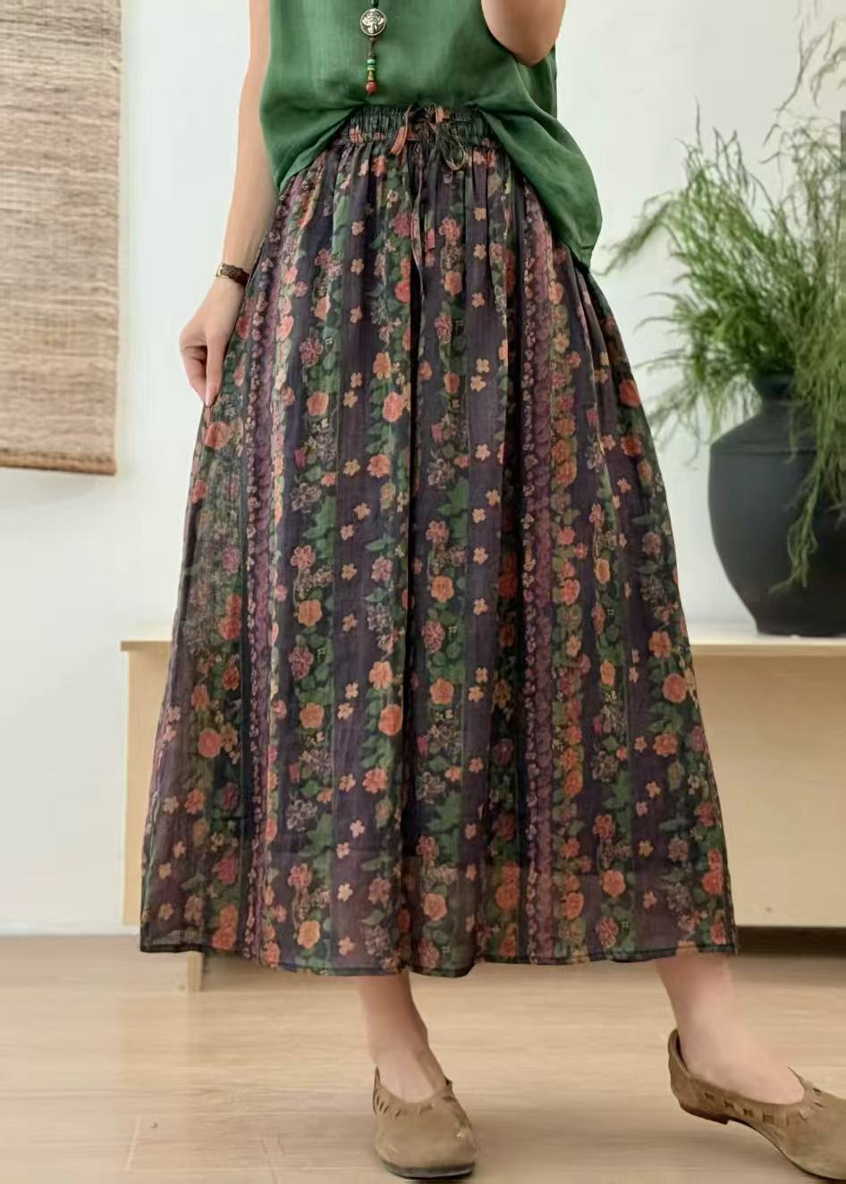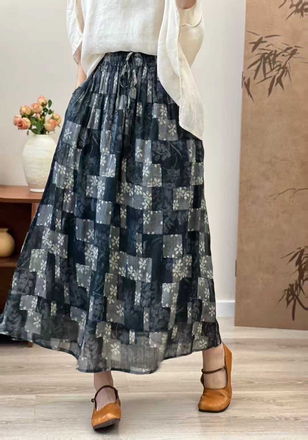 빈티지 예술적 퓨어 라미 인쇄 더블 레이어 스커트 민족 스타일 대비 컬러 느슨한 우아한 여성의 스트레스 허리 A 라인 스커트스토어 가기