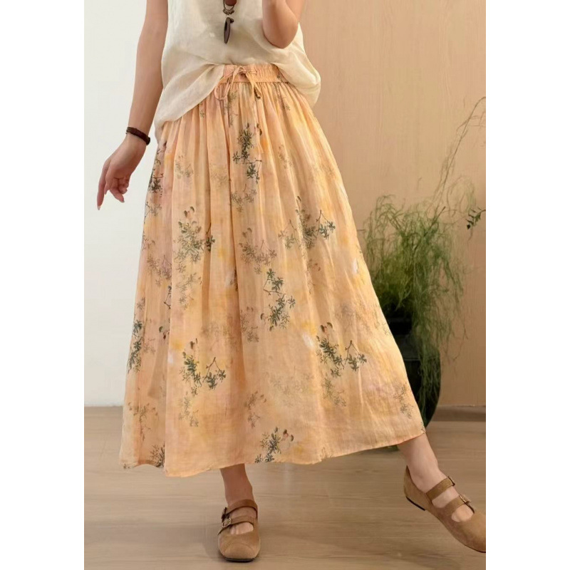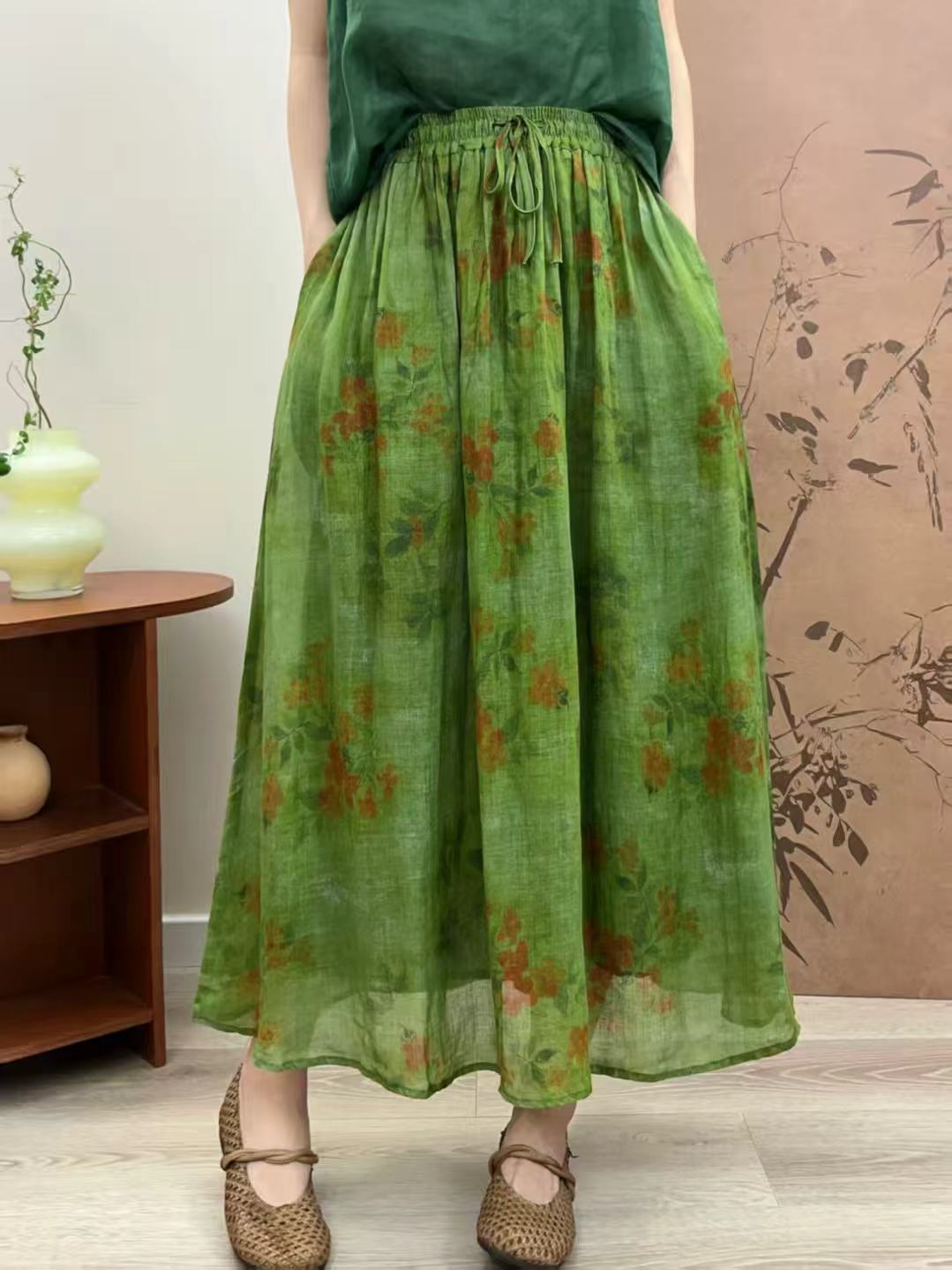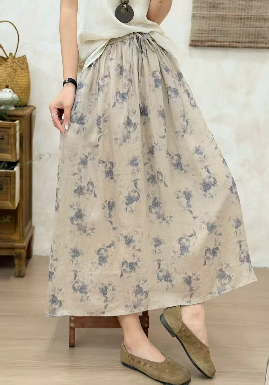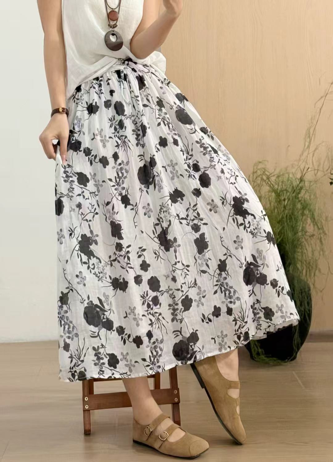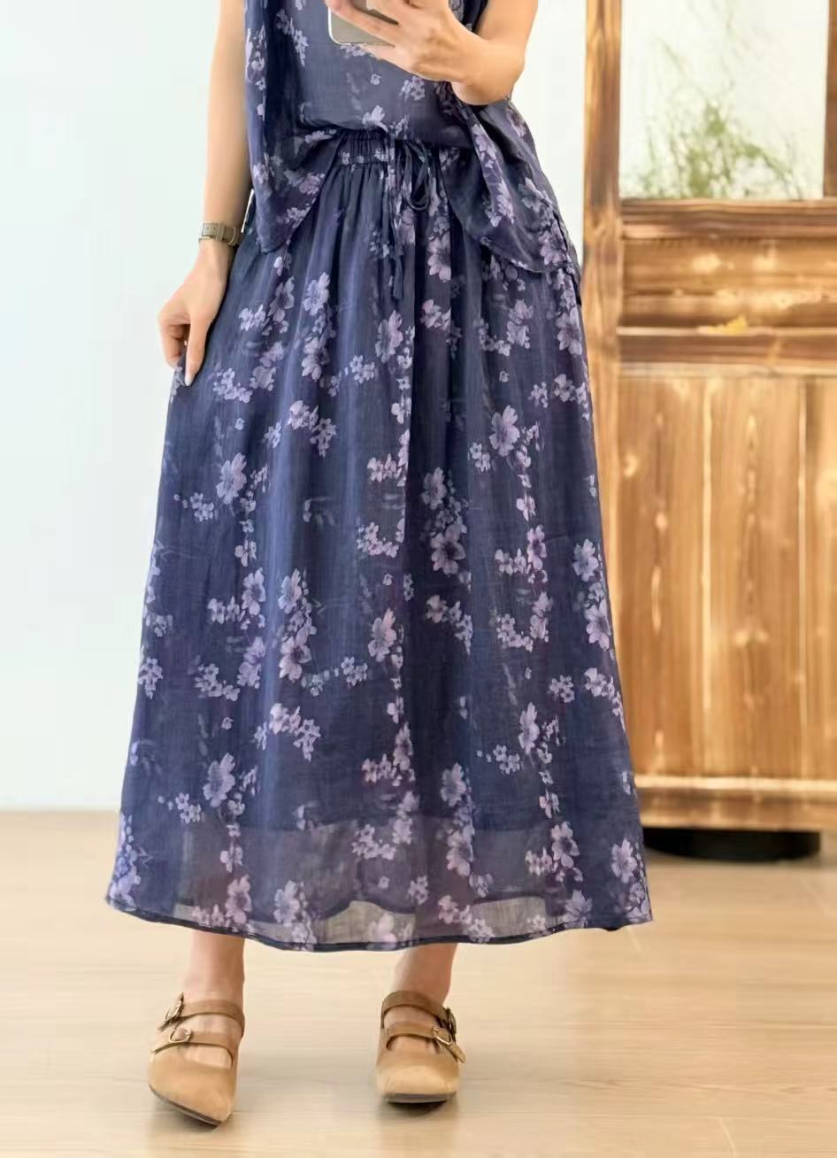 빈티지 예술적 퓨어 라미 인쇄 더블 레이어 스커트 민족 스타일 대비 컬러 느슨한 우아한 여성의 스트레스 허리 A 라인 스커트스토어 가기