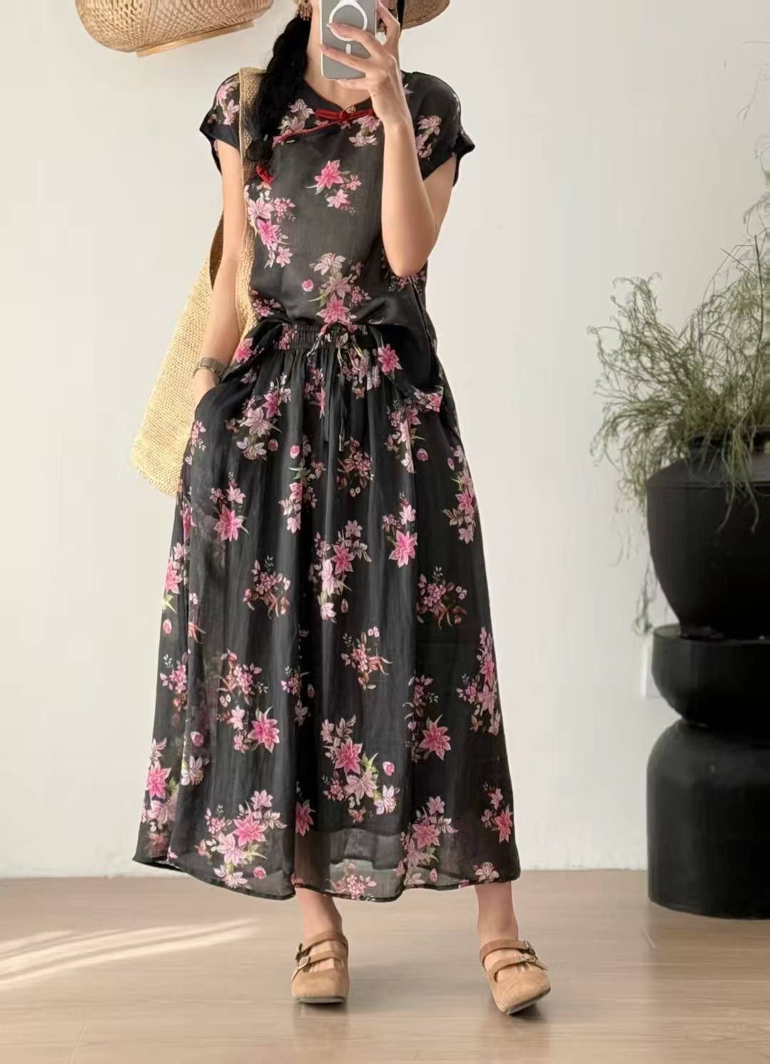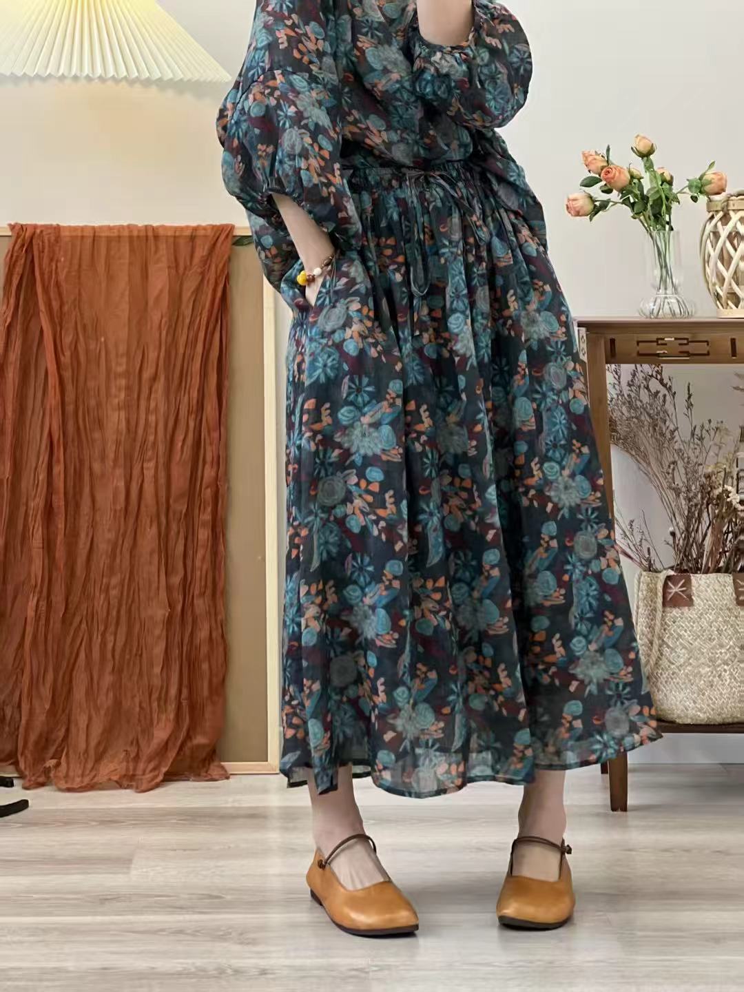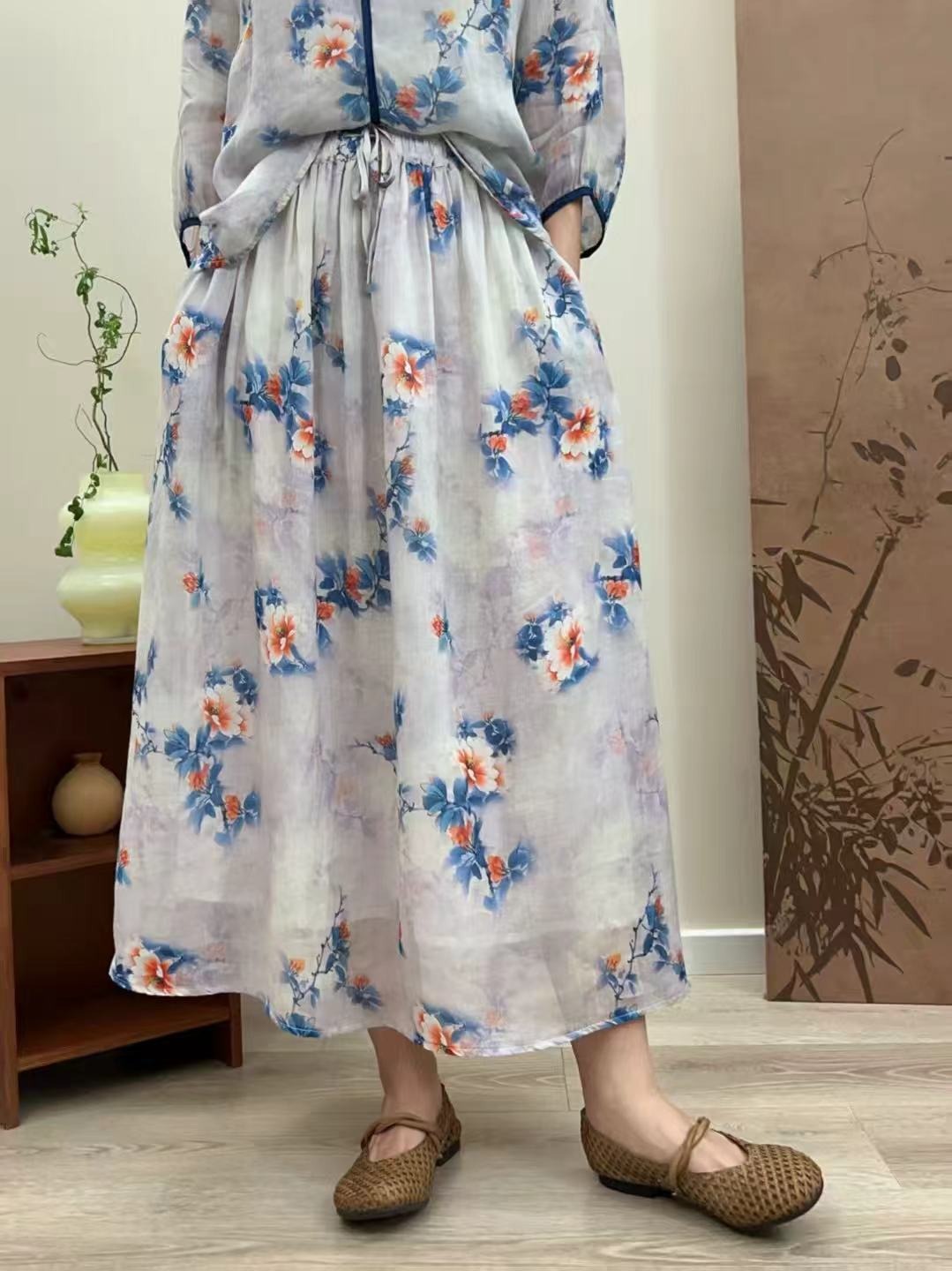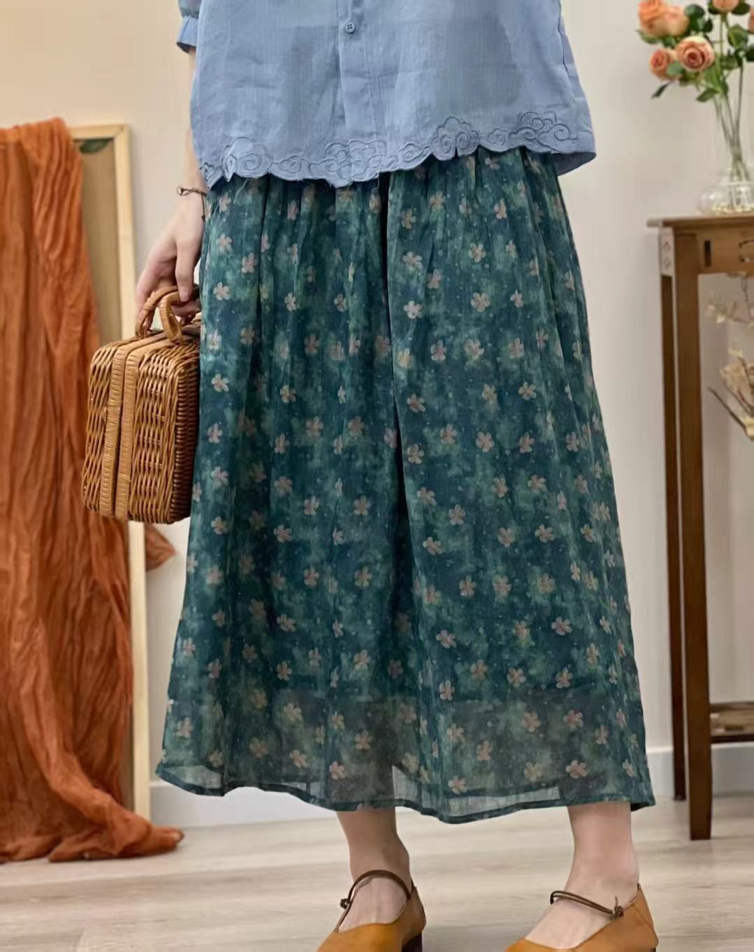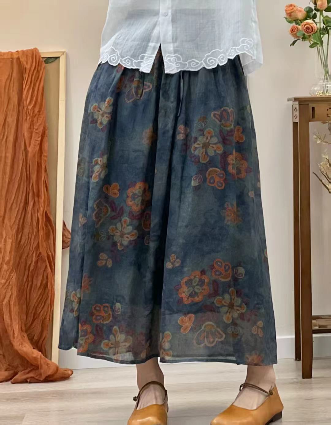 빈티지 예술적 퓨어 라미 인쇄 더블 레이어 스커트 민족 스타일 대비 컬러 느슨한 우아한 여성의 스트레스 허리 A 라인 스커트스토어 가기