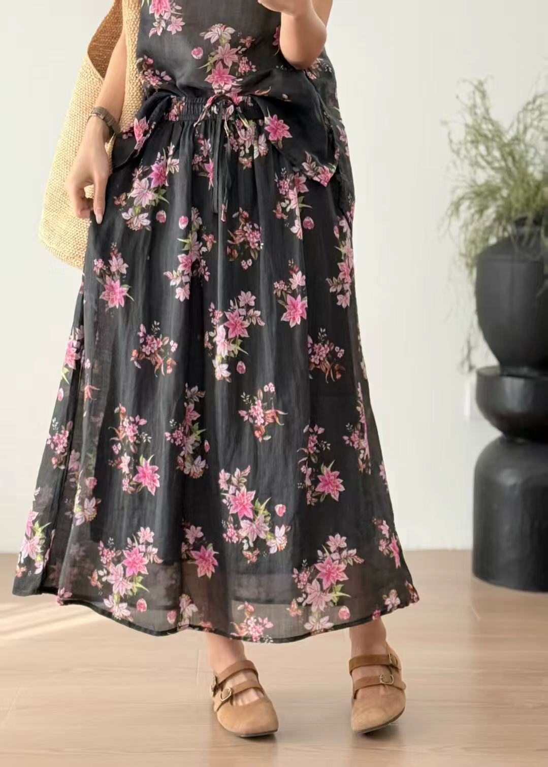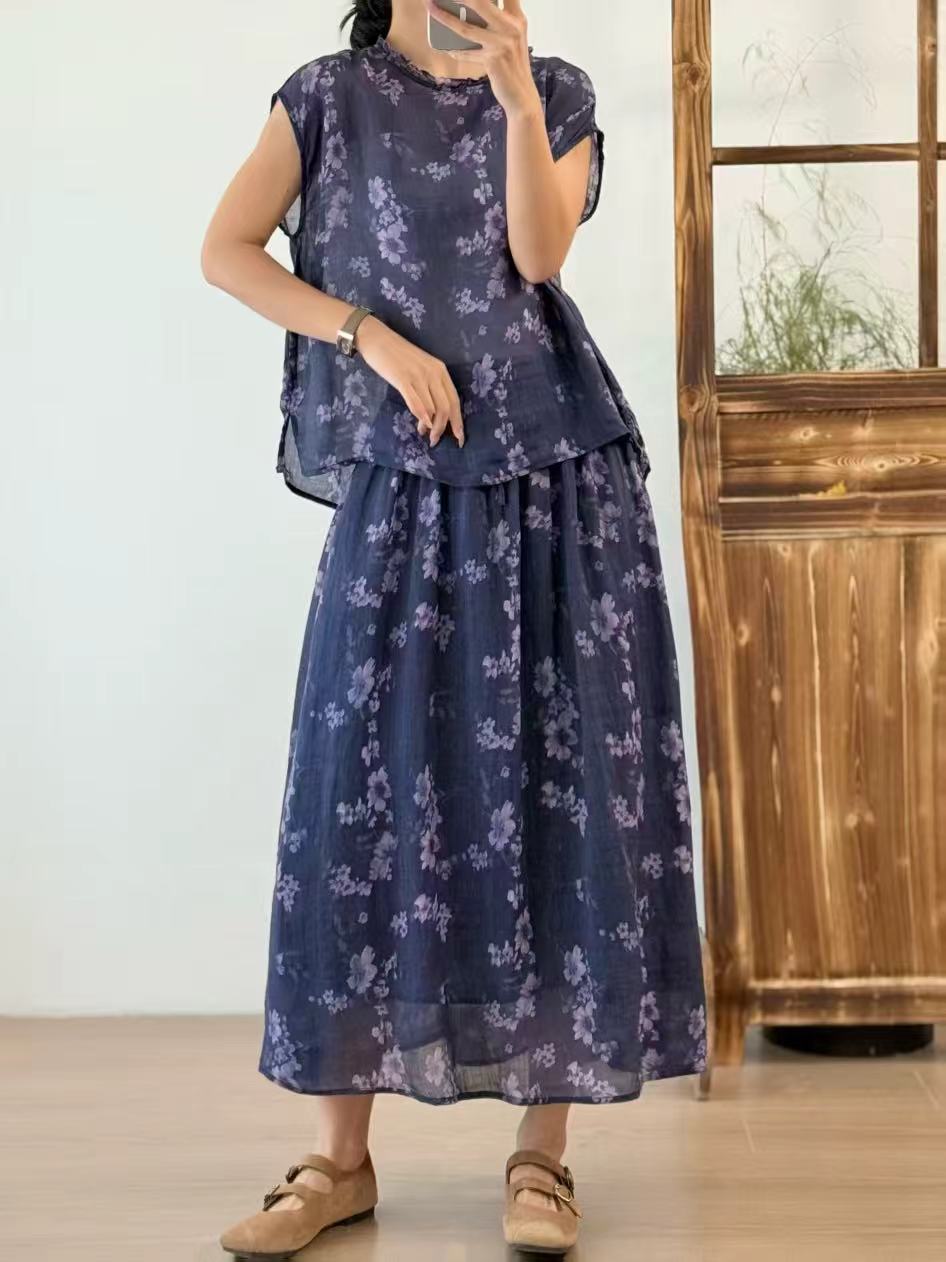 빈티지 예술적 퓨어 라미 인쇄 더블 레이어 스커트 민족 스타일 대비 컬러 느슨한 우아한 여성의 스트레스 허리 A 라인 스커트