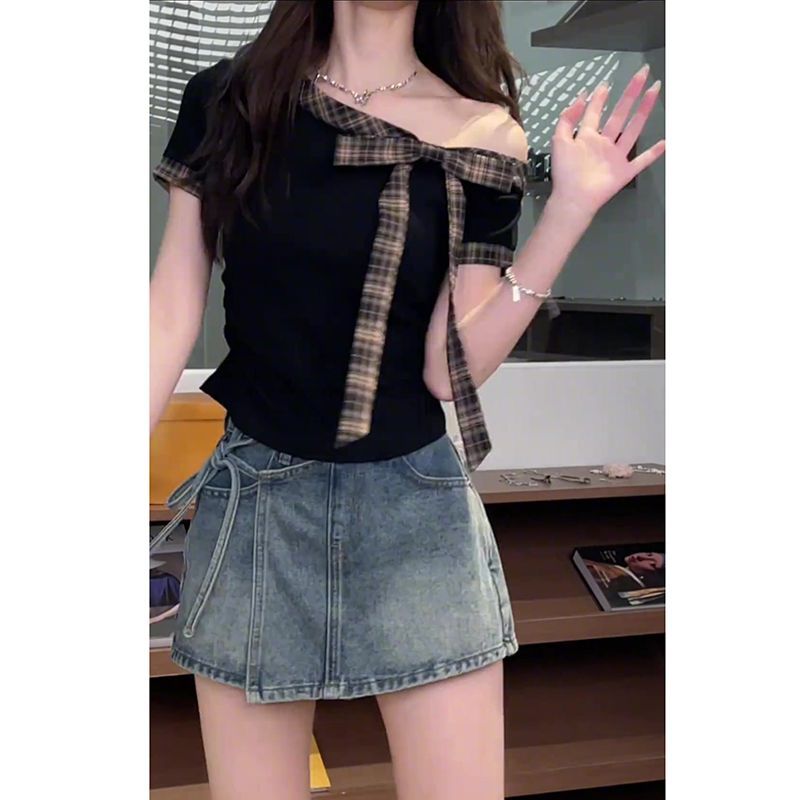 플러스 사이즈 프렌치 스위트 스타일 스플 라이스 스트라이프 스트랩 보우 반팔 티셔츠 여성용 여름 슬림 탑스토어 가기