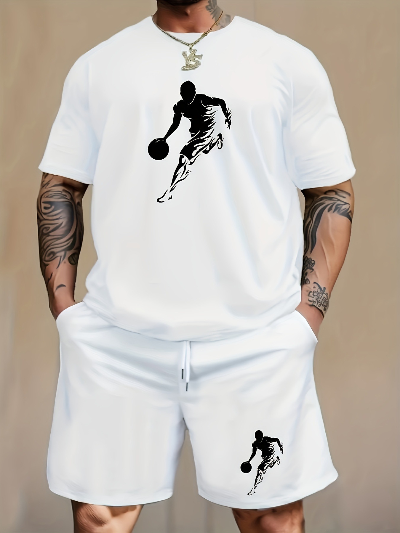 남성용 스포츠 및 레저 의류 세트, 여름 프린트 농구 선수 패턴 반팔 티셔츠, 드로스트링 반바지, 라운드 넥
