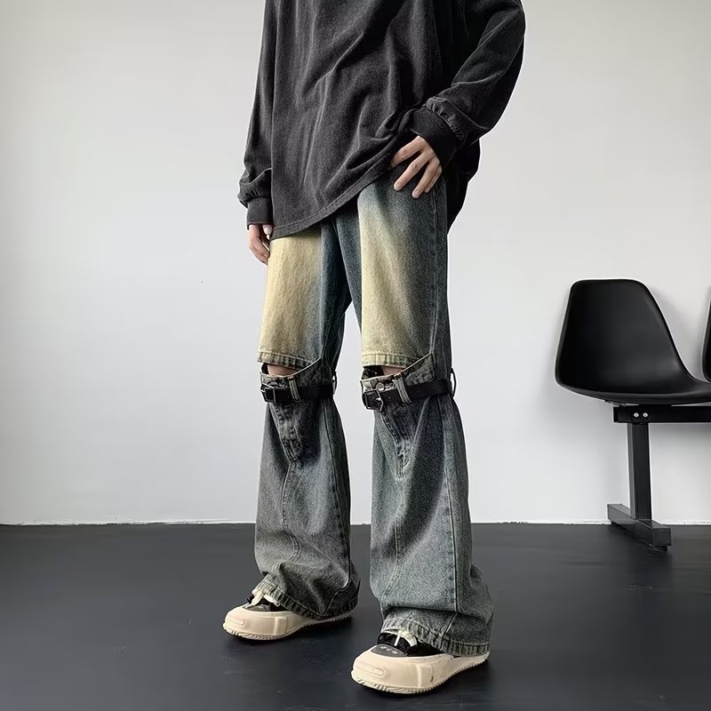 니치 레트로 디스트레스드 입체 스플라이싱 무릎 찢어진 벨트 스트랩 디자인 남성용 아메리칸 하이 스트리트 마이크로 플레어 청바지스토어 가기