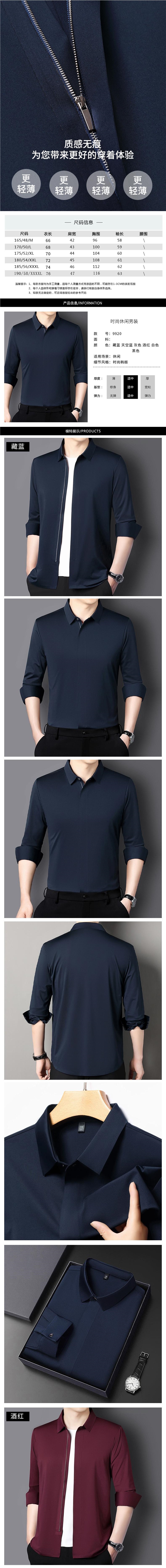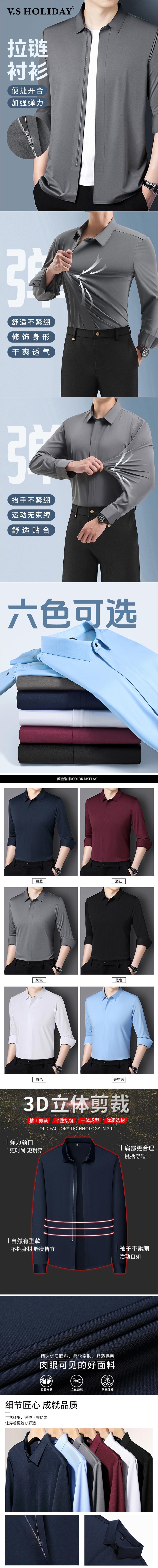 V.SHOLIDAY 봄 남성 패션 솔리드 컬러 지퍼 플래킷 심리스 비즈니스 캐주얼 긴팔 셔츠/B9920