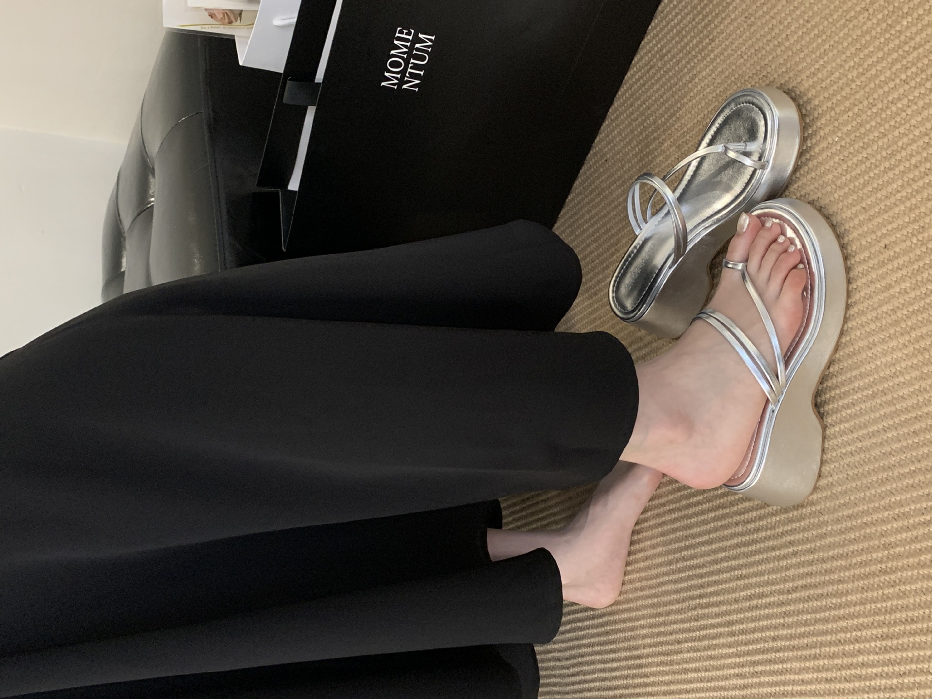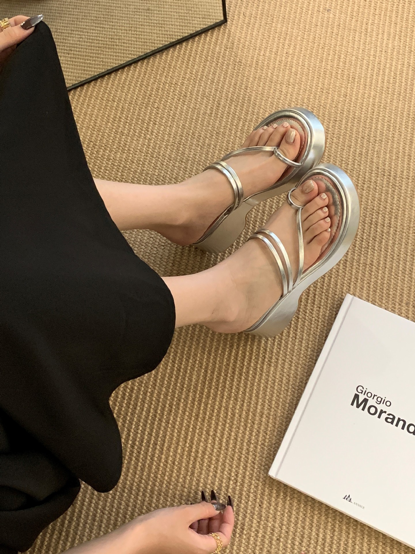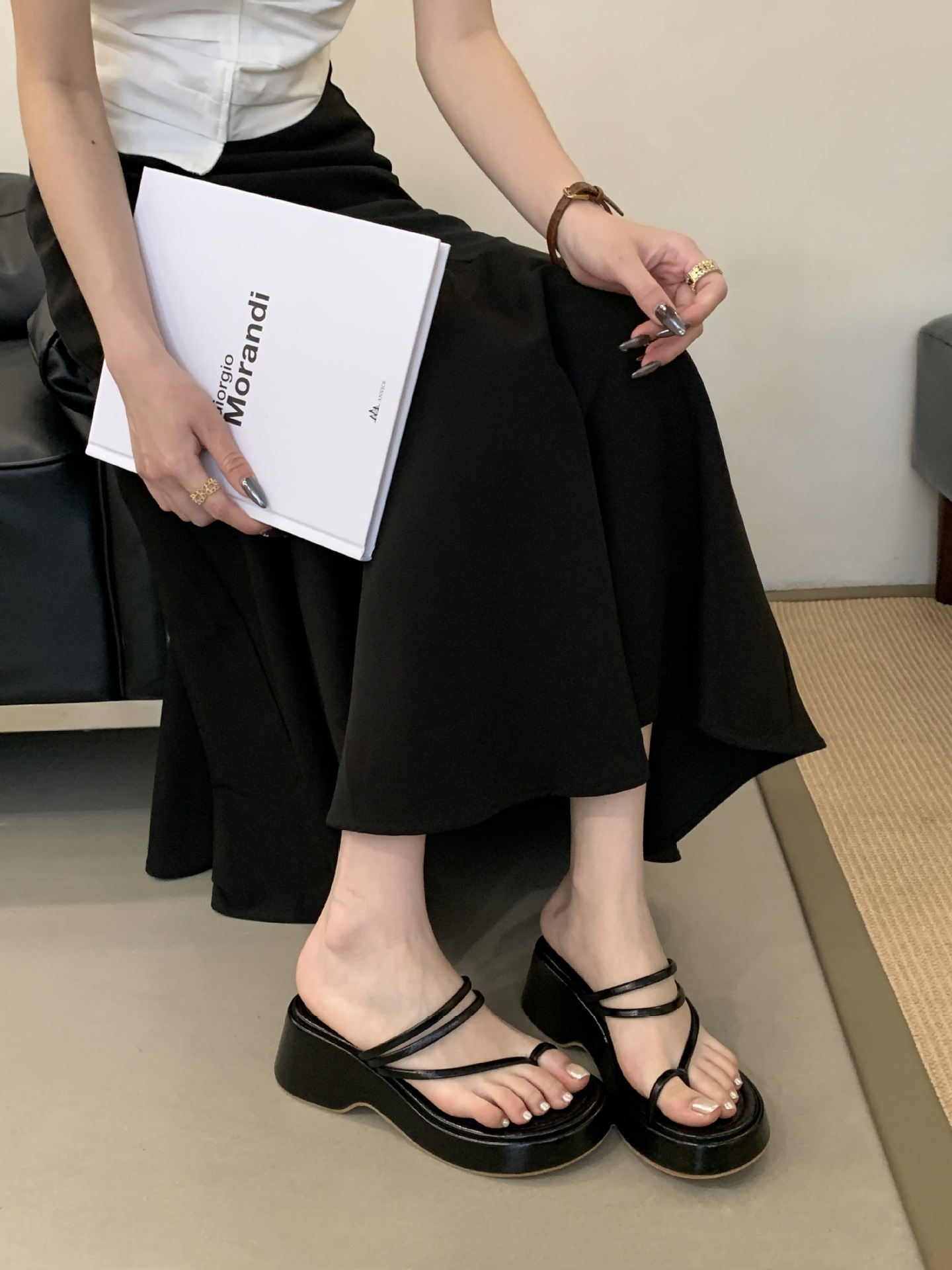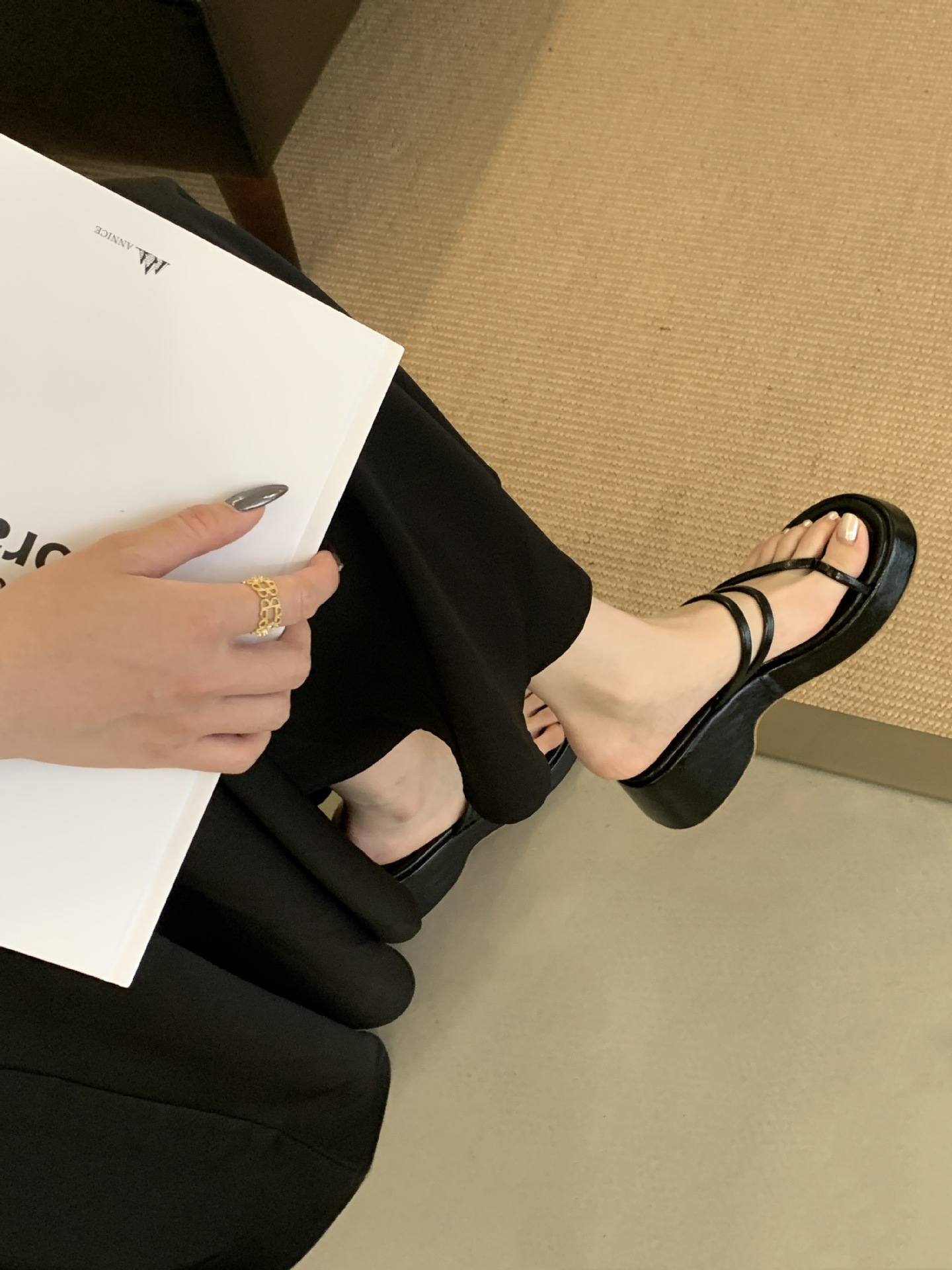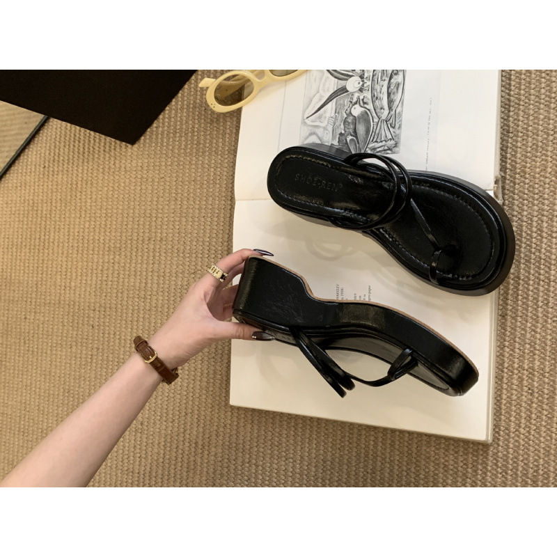 여성을위한 한국 스타일 라운드 발가락 얇은 스트랩 디자인 오픈 발가락 샌들 2025 새로운 두꺼운 밑창 웨지 슬리퍼