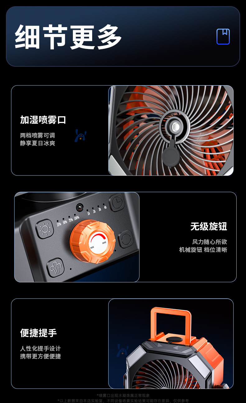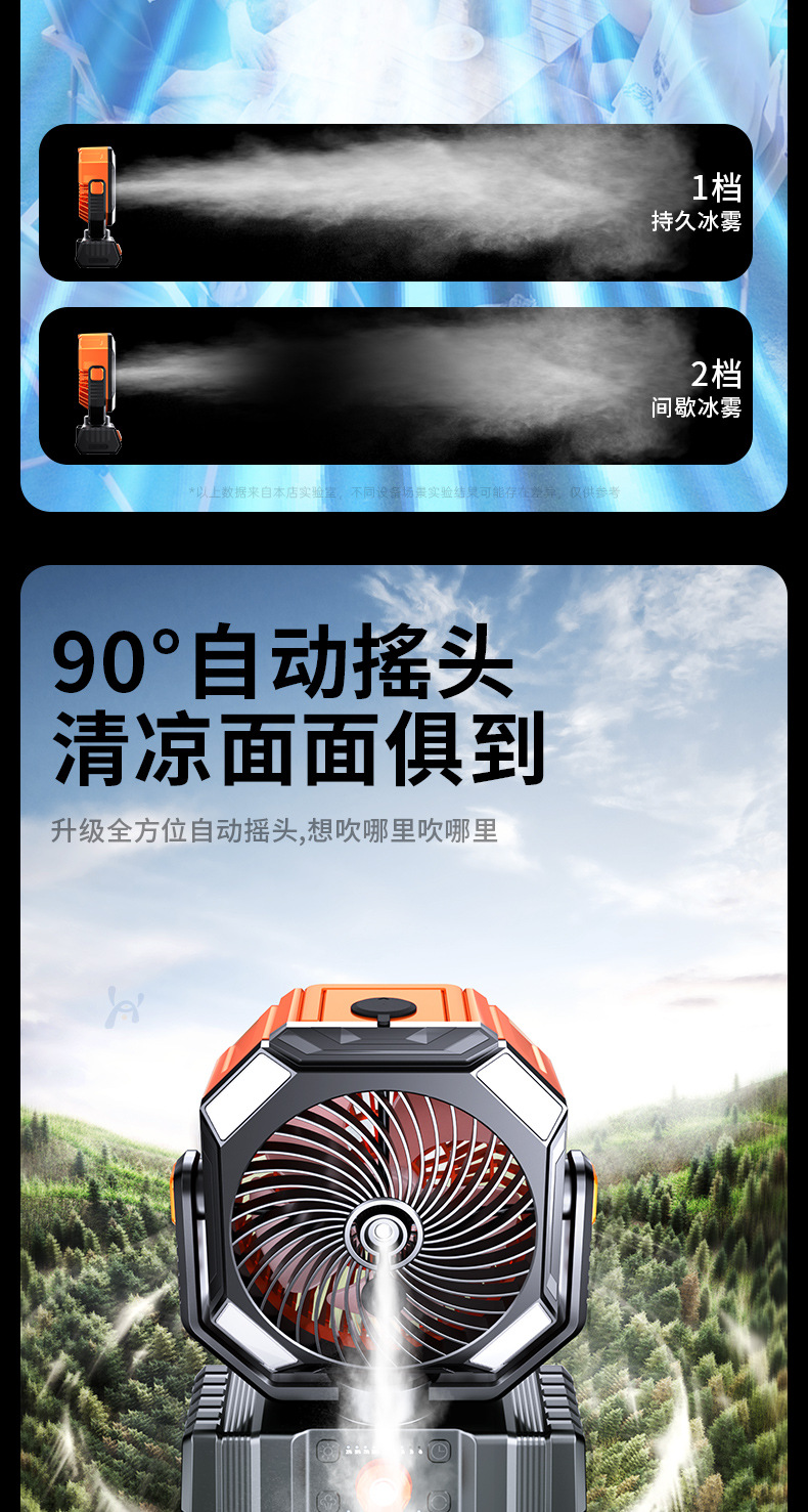 • 울트라 [바이브런트 오렌지] 10,000mAh/스프레이 가습/5단계 강력한 냉풍/5개의 팬 블레이드/서지 냉풍/조명 내장/조용한 소음 감소 0mAh