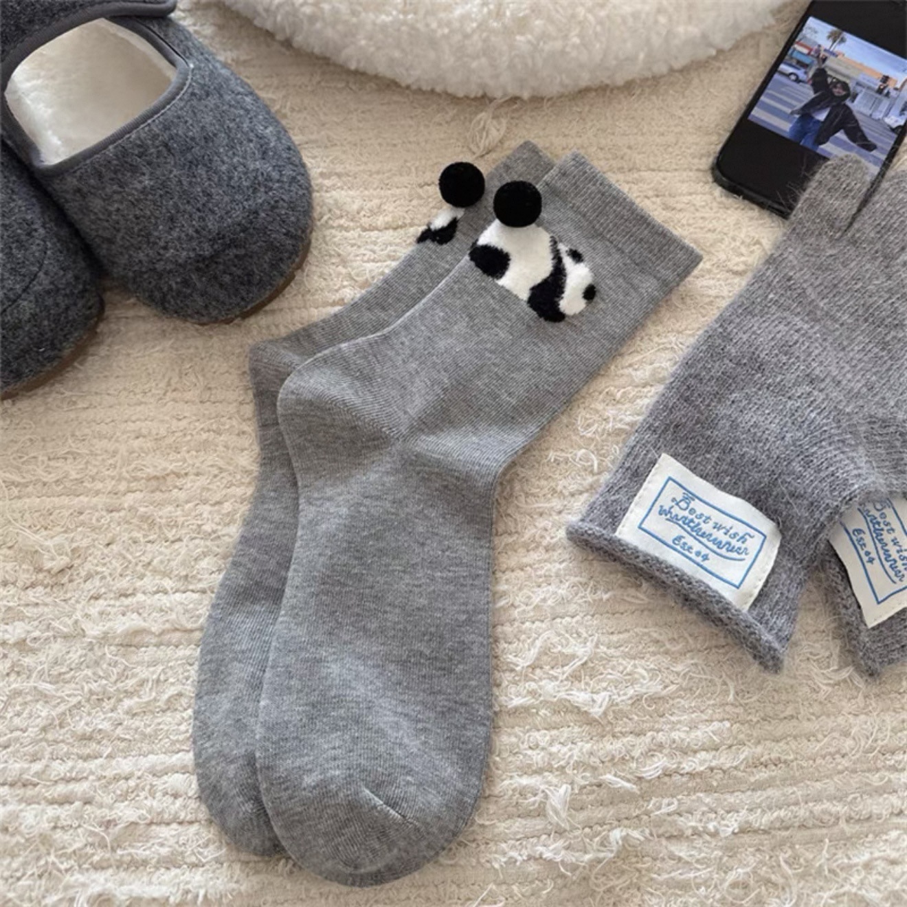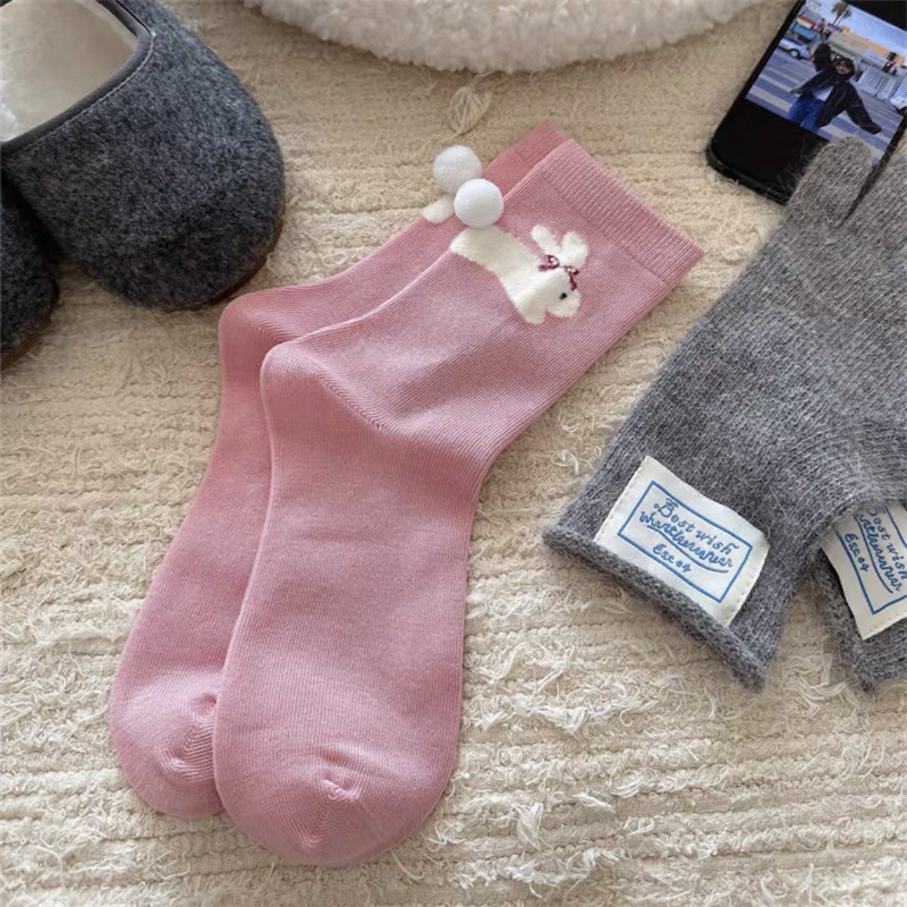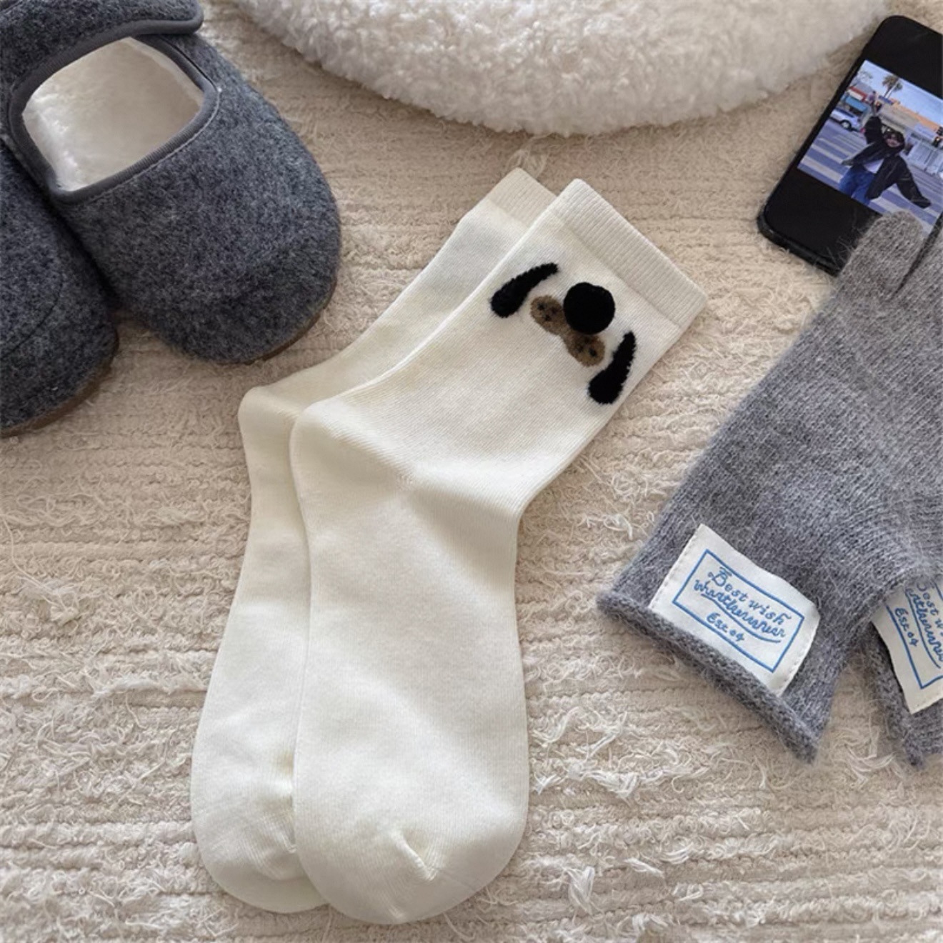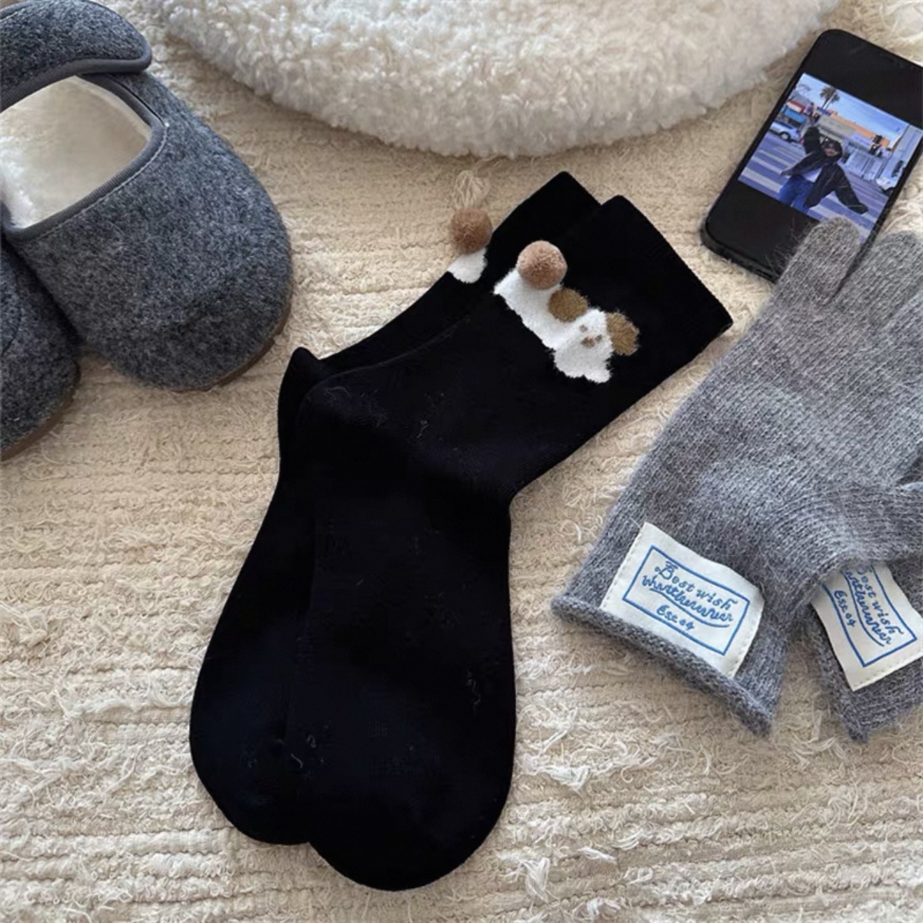 동물원 볼 양말~플록드 작은 동물 입체 털볼 미드 종아리 양말 소녀 양말 만화 양말스토어 가기