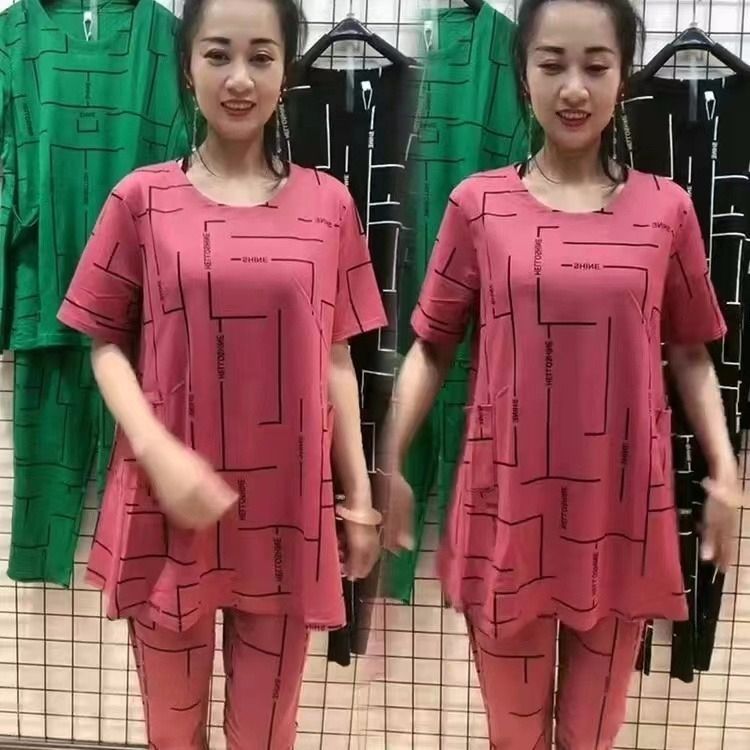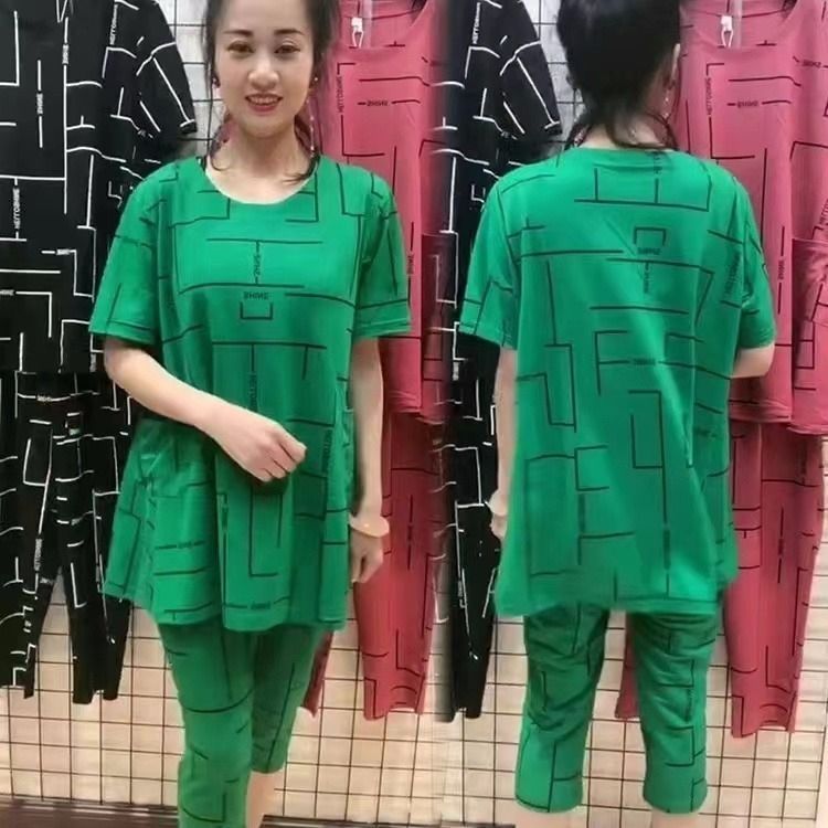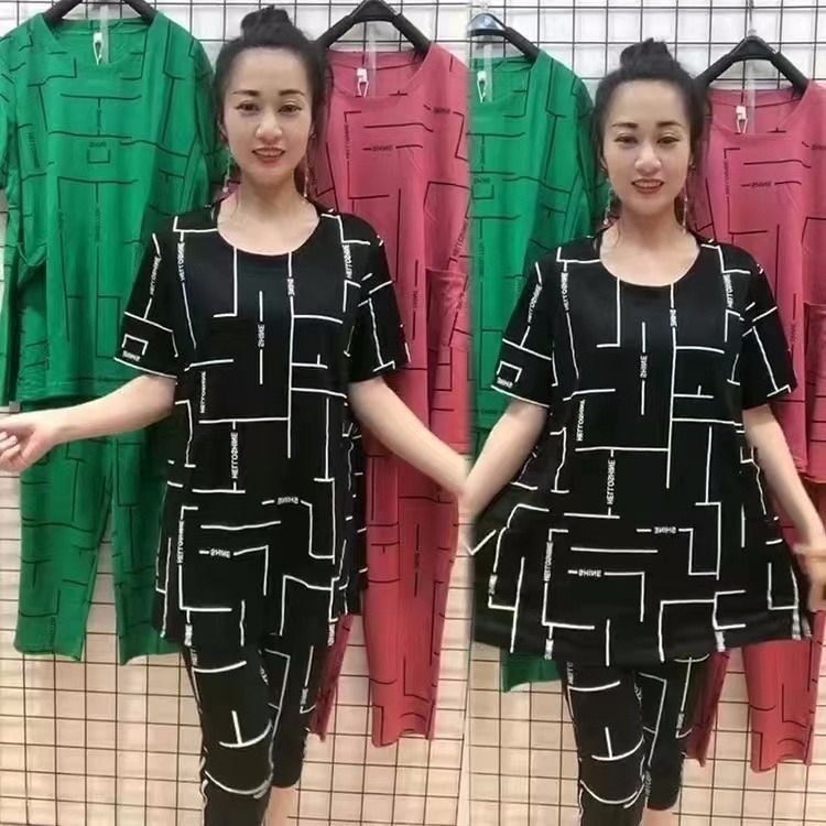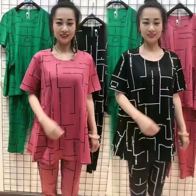 플러스 사이즈 100.00kg 외국 스타일 느슨한 중년 및 노인 여성 의류 뚱뚱한 어머니 세트 짧은 소매 2025 여름 세트스토어 가기