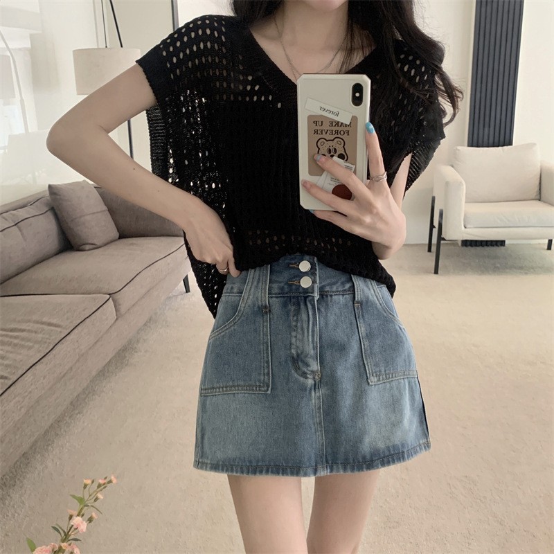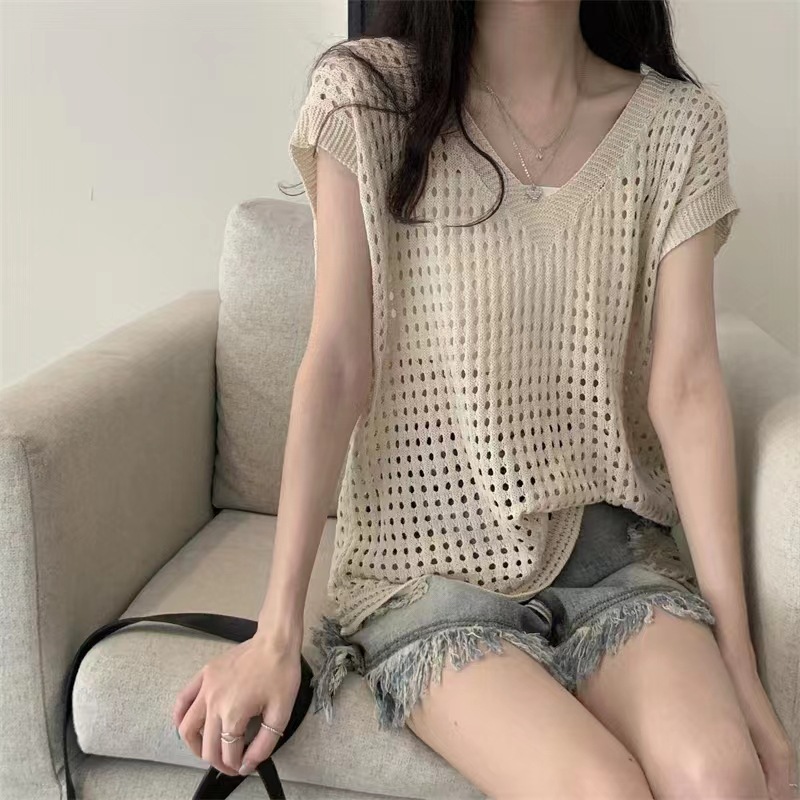국경 간 2025 새로운 여름 스타일 얇은 중공 v 넥 니트 블라우스 게으른 스타일 조끼 탑 여성 민소매 겉옷스토어 가기