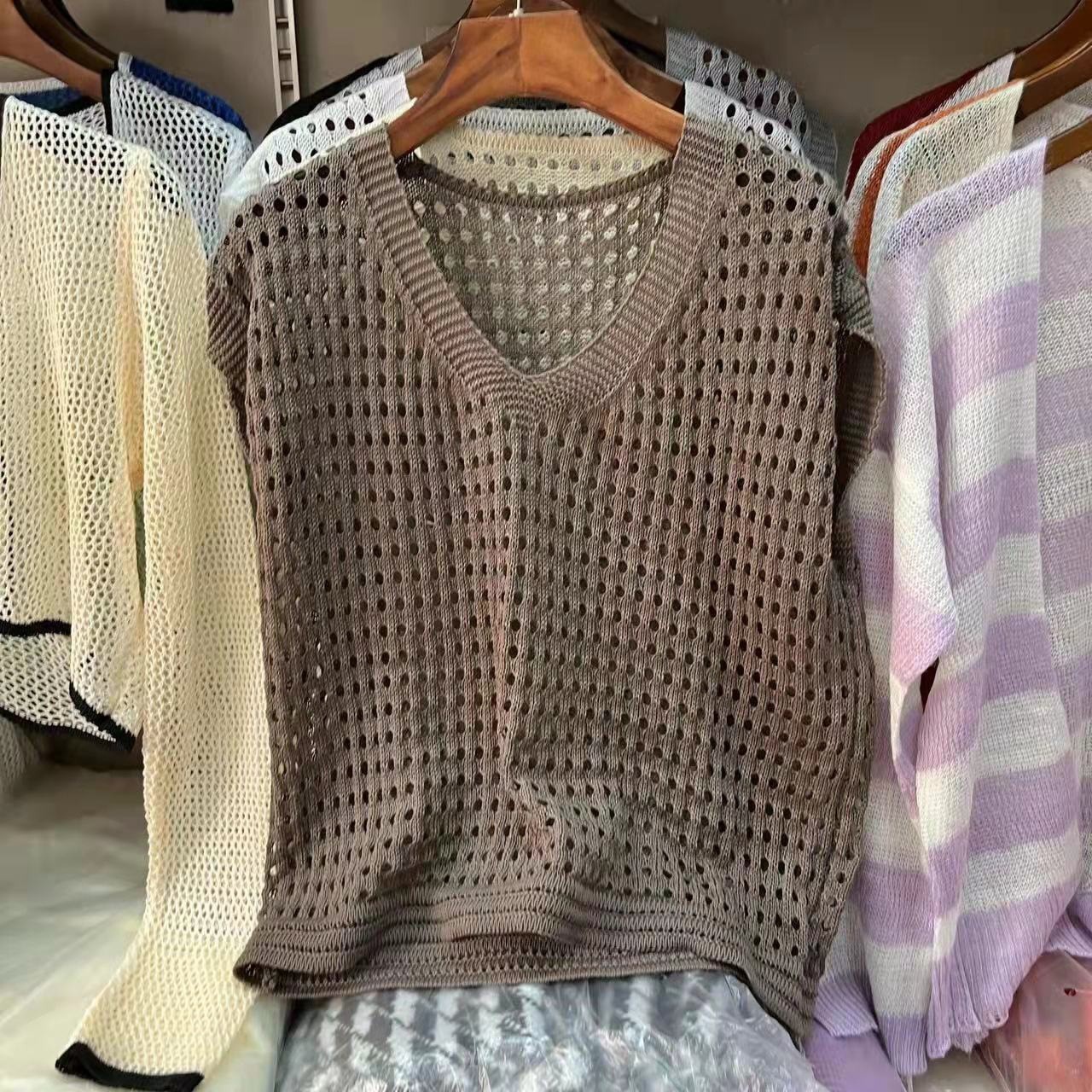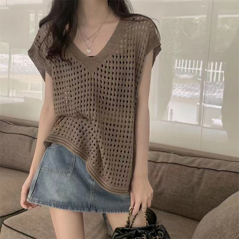 국경 간 2025 새로운 여름 스타일 얇은 중공 v 넥 니트 블라우스 게으른 스타일 조끼 탑 여성 민소매 겉옷