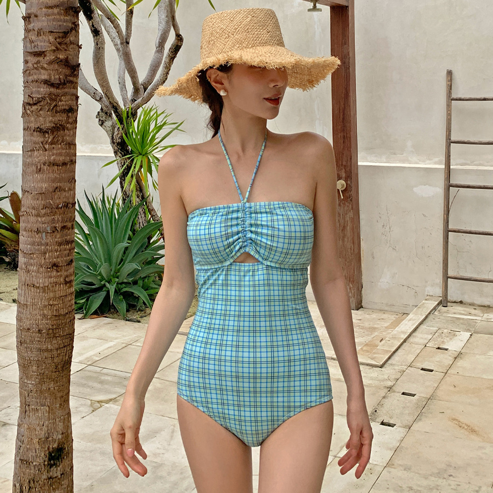 도매 한국 달콤한 소녀 격자 무늬 원피스 수영복 섹시한 홀터넥 튜브 탑 학생 보수적 인 휴가 수영복 여성
