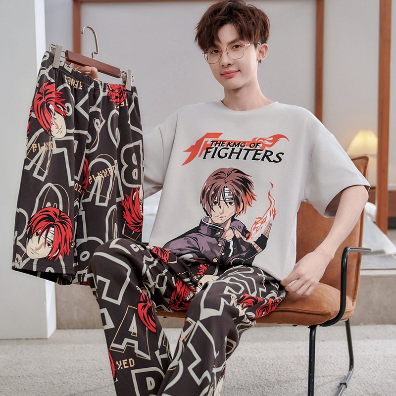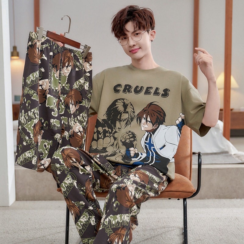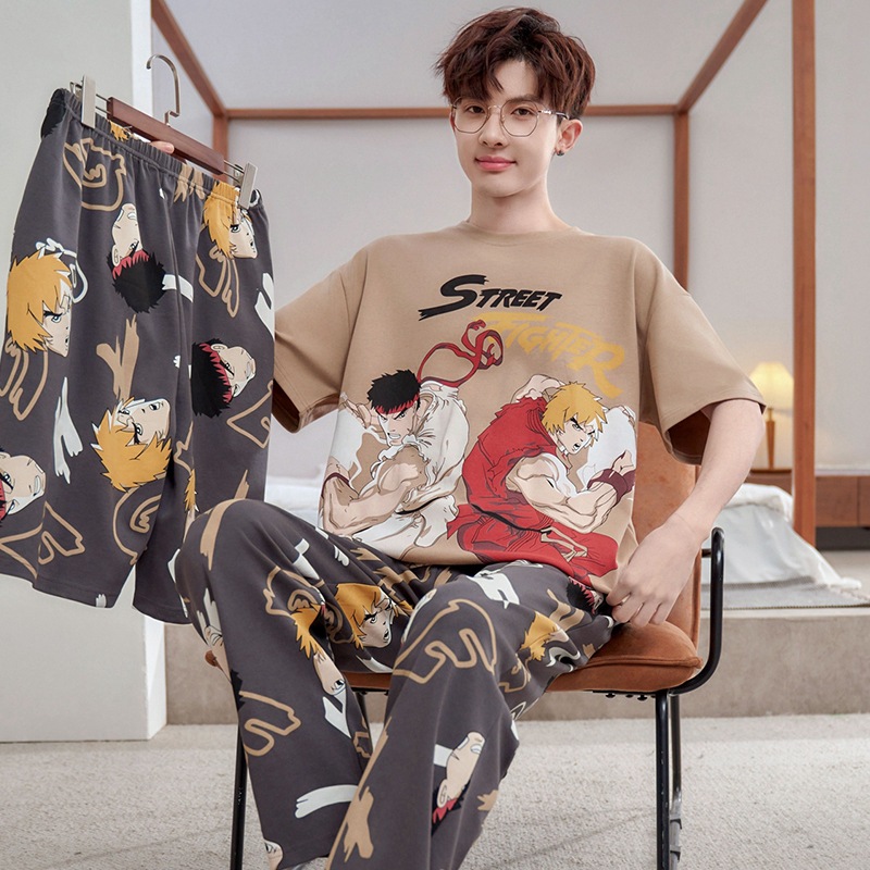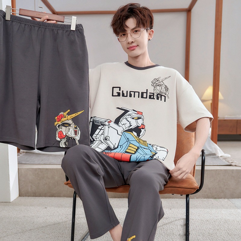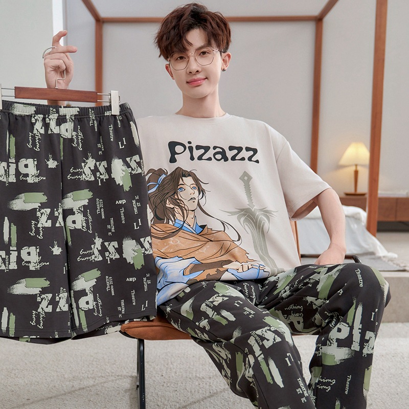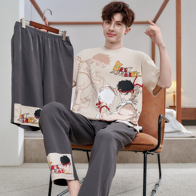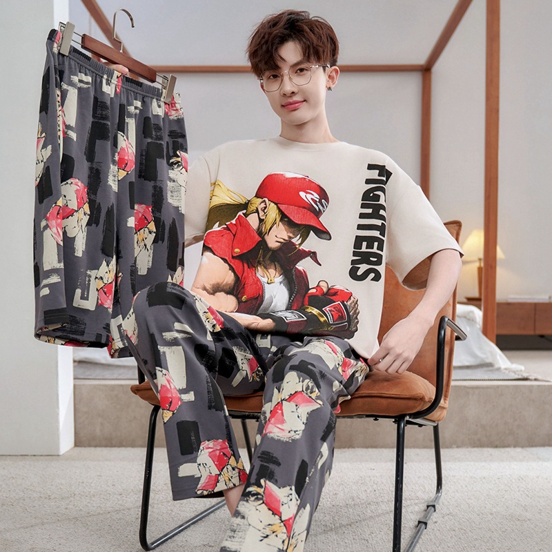 남성용 여름 잠옷, 순면, 얇은 반팔 바지, 가을 만화 청소년 남성용 3피스 슈트, 홈웨어스토어 가기