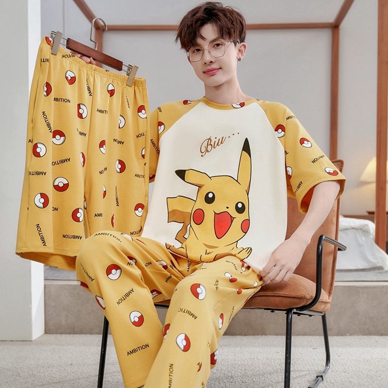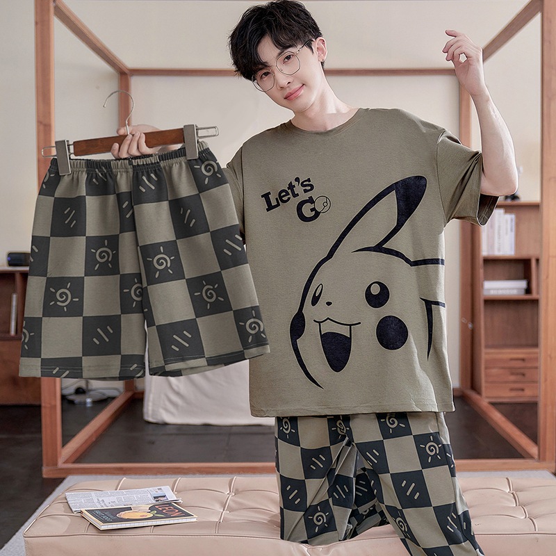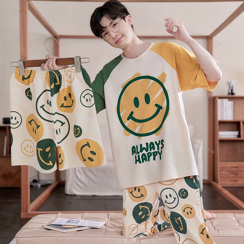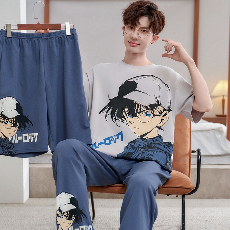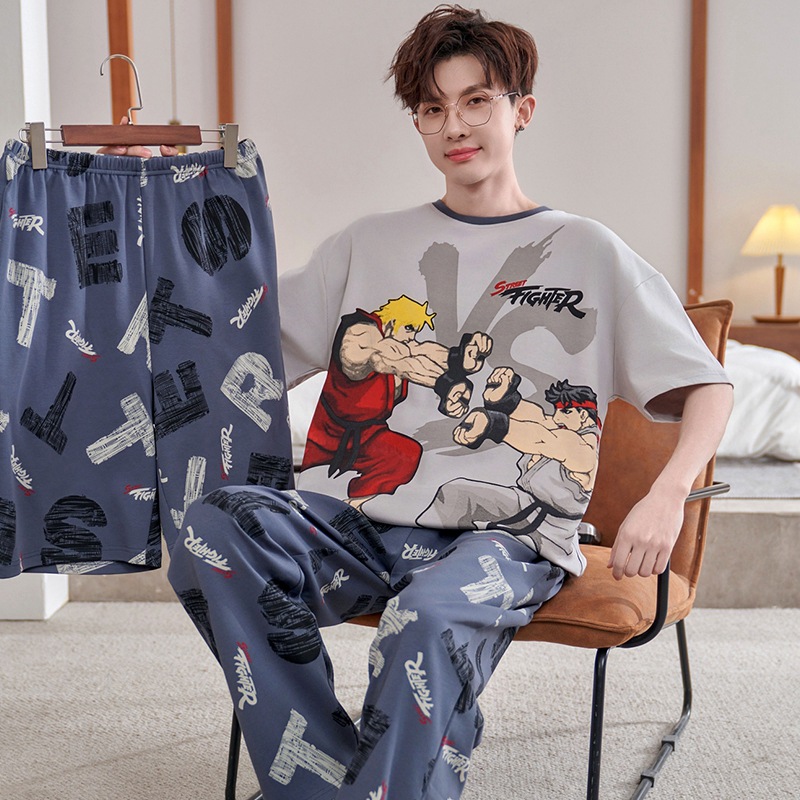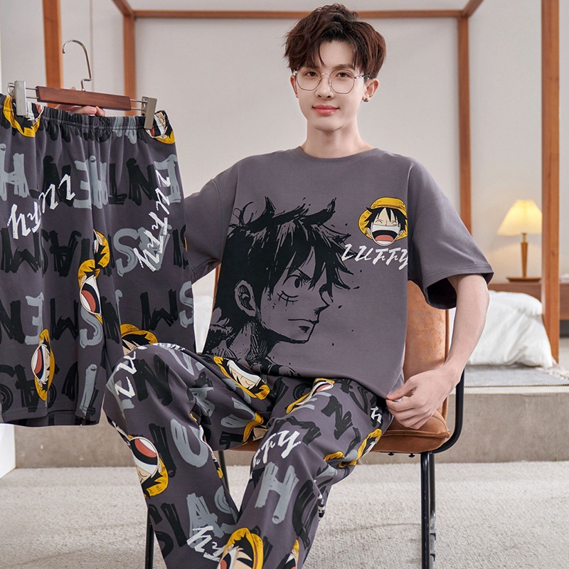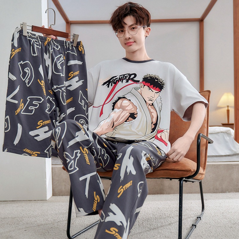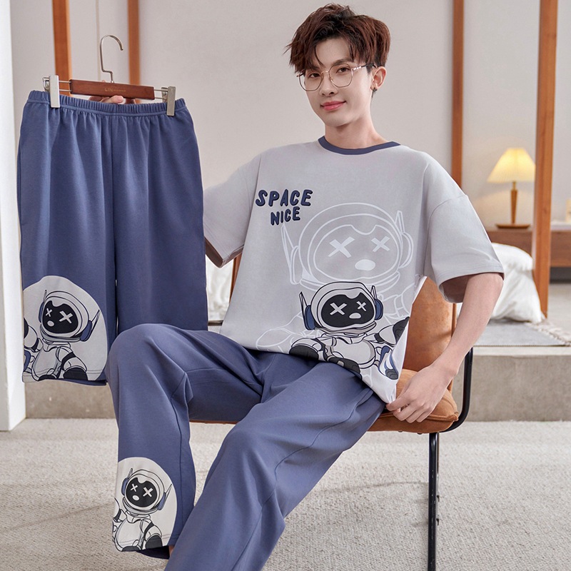 남성용 여름 잠옷, 순면, 얇은 반팔 바지, 가을 만화 청소년 남성용 3피스 슈트, 홈웨어스토어 가기