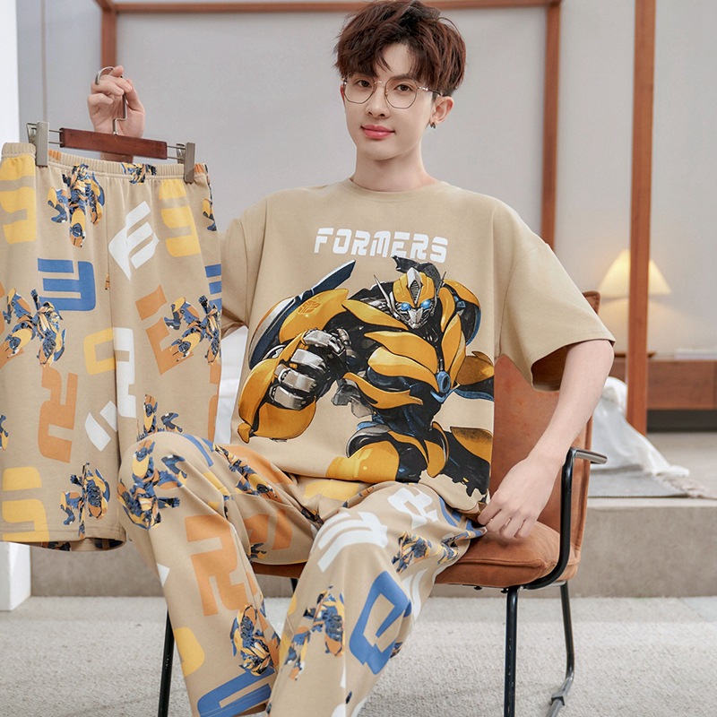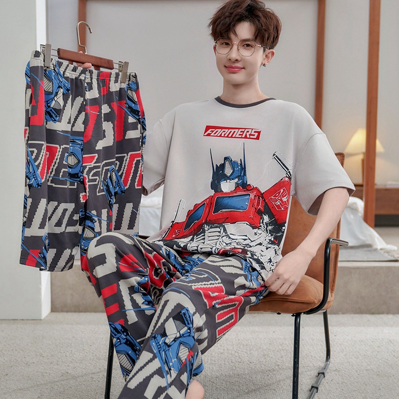 남성용 여름 잠옷, 순면, 얇은 반팔 바지, 가을 만화 청소년 남성용 3피스 슈트, 홈웨어