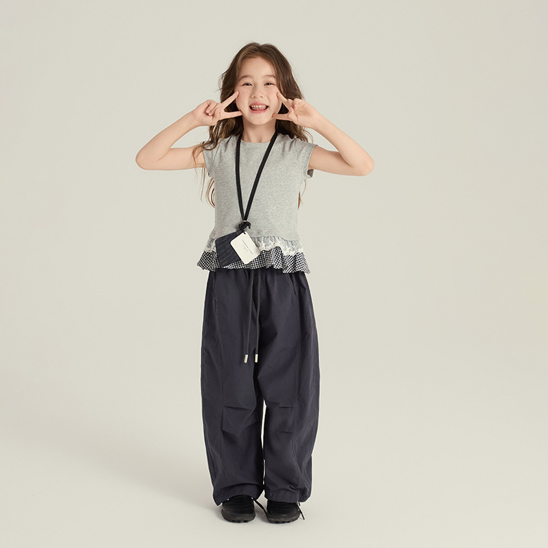 엘모 베이 베이 소녀 한국 스타일 스티칭 레이스 체크 무늬 짧은 소매 여름 새로운 어린이 올 매치 핫 걸 티셔츠 탑